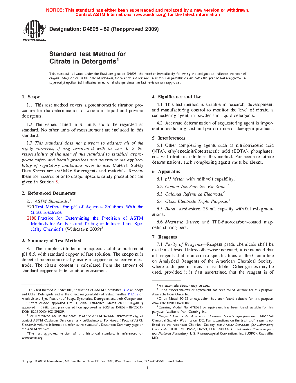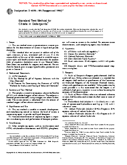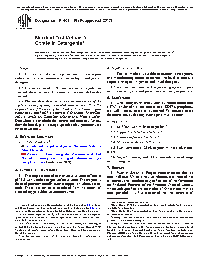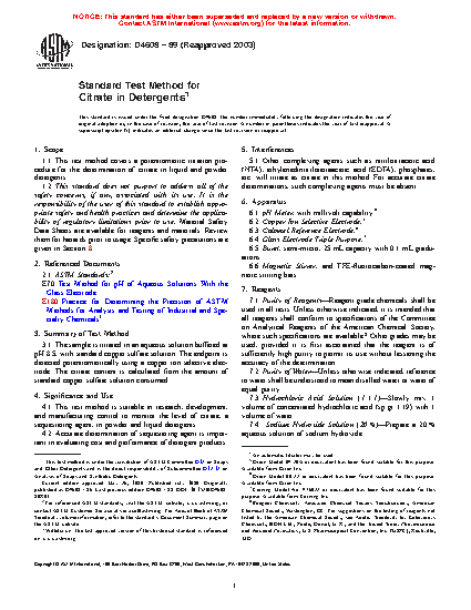 4.1 This test method is suitable in research, development, and manufacturing control to monitor the level of citrate, a sequestering agent, in powder and liquid detergents.
