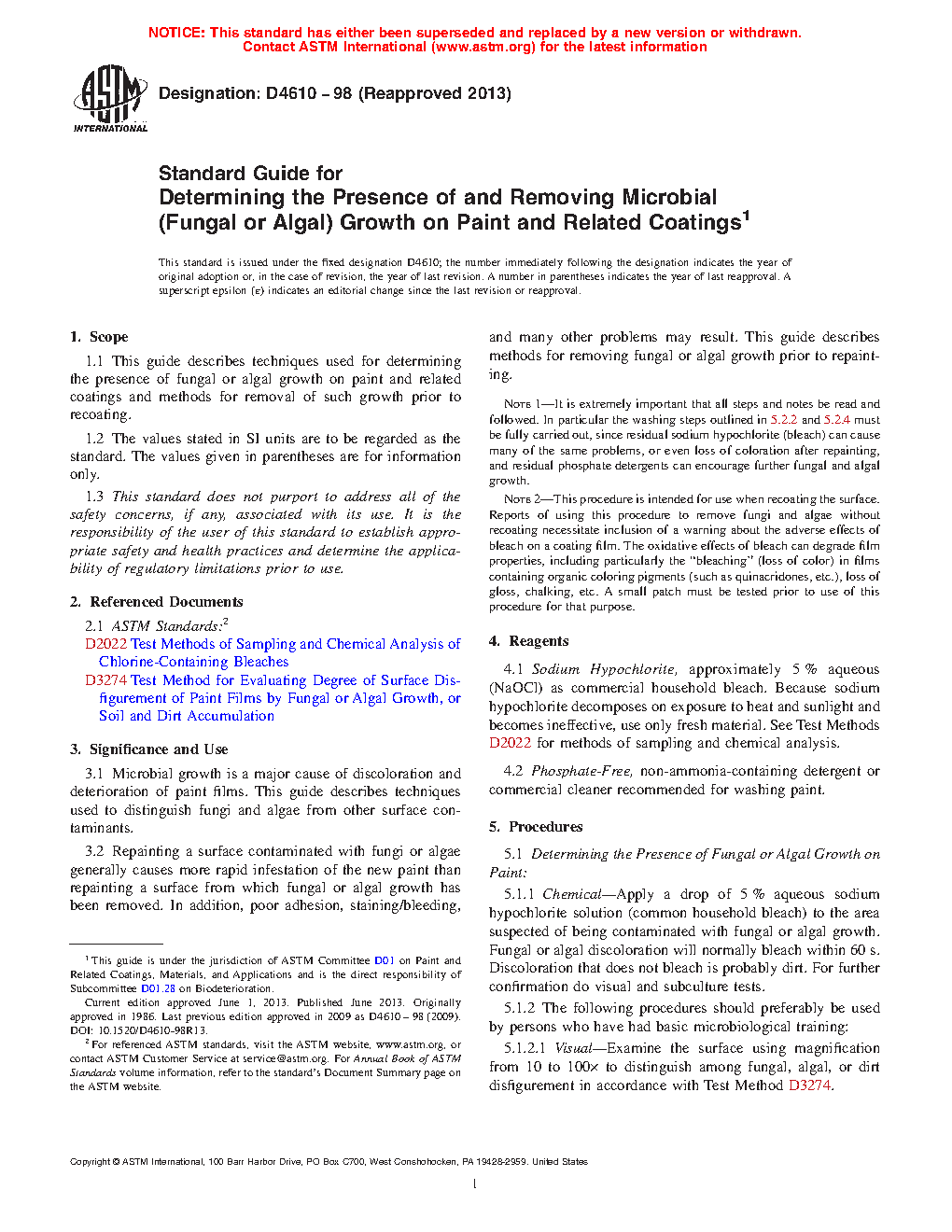 1.1 This guide describes techniques used for determining the presence of fungal or algal growth on paint and related coatings and methods for removal of such growth prior to recoating.