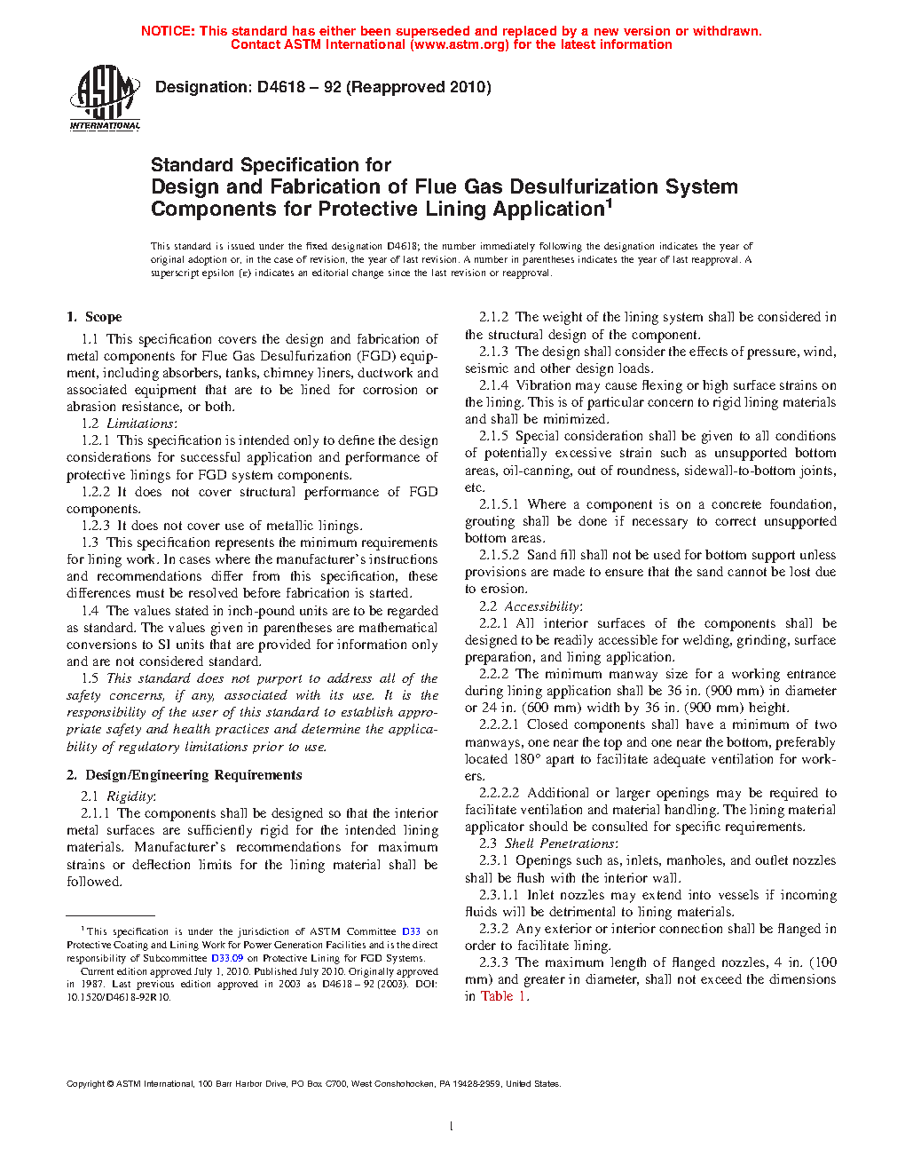 1.2.1 This specification is intended only to define the design considerations for successful application and performance of protective linings for FGD system components.