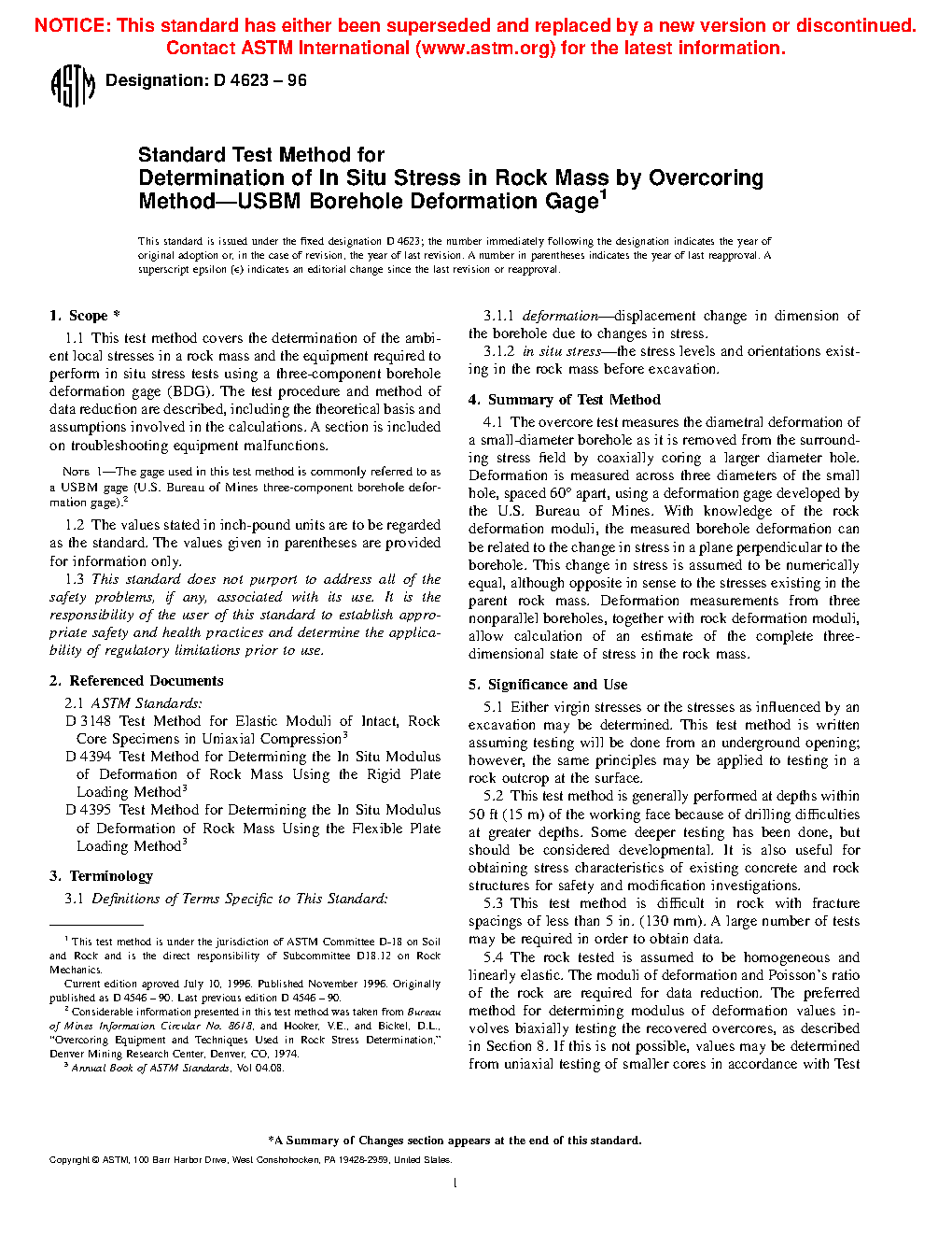 5.2 This test method is generally performed at depths within 50 ft (15 m) of the working face because of drilling difficulties at greater depths. Some deeper testing with this gauge has been done, but should be considered developmental. This test method has a long and proven record and considered very accurate relative to many other techniques, both new and old, out there. Other overcoring methods that use instruments that are different, but follow much of the same basic concepts are now available and can go deeper; however, the pros and cons of each method need to be carefully compared to this test method.