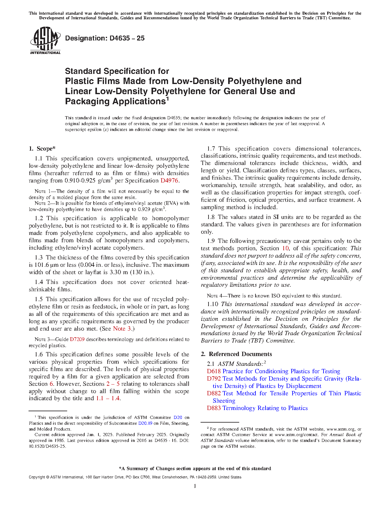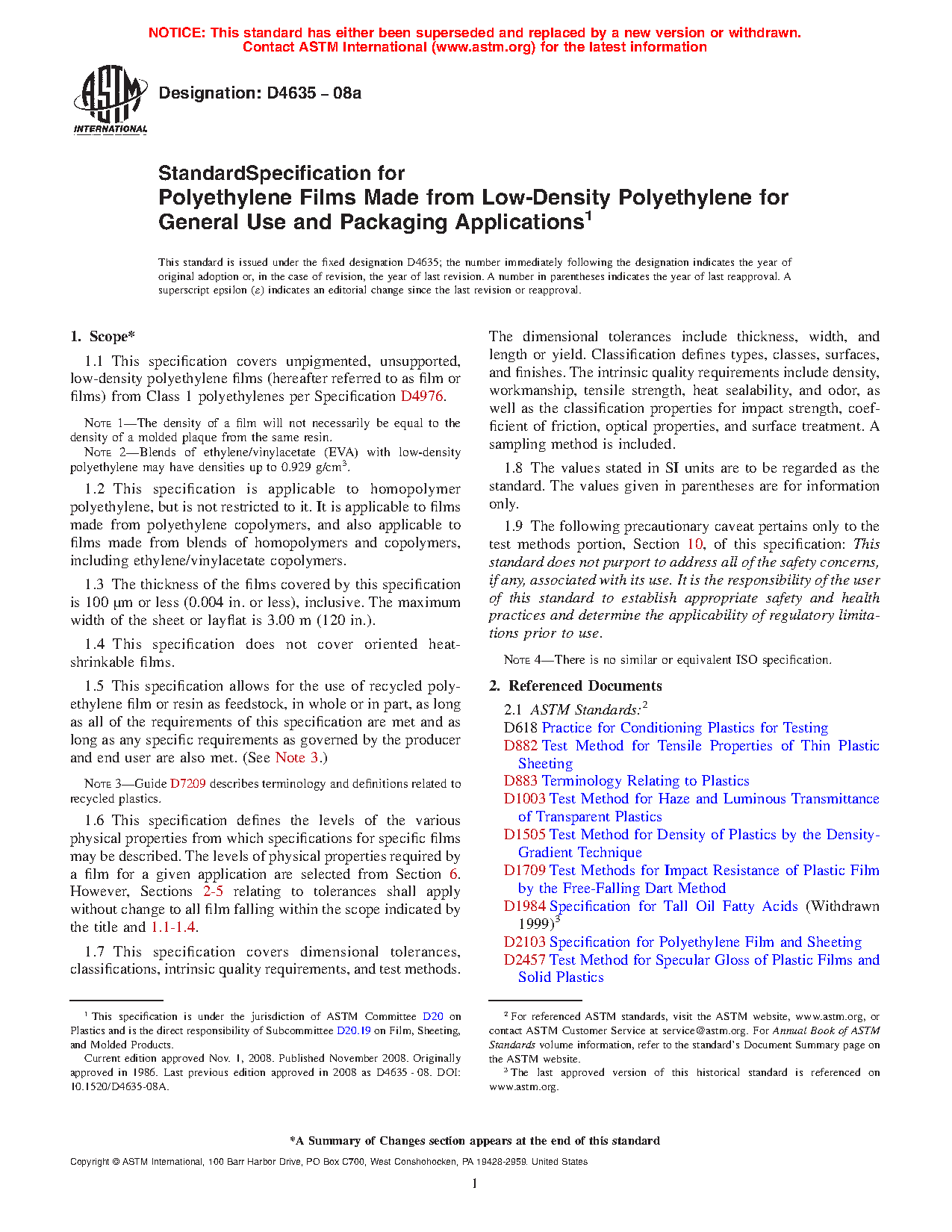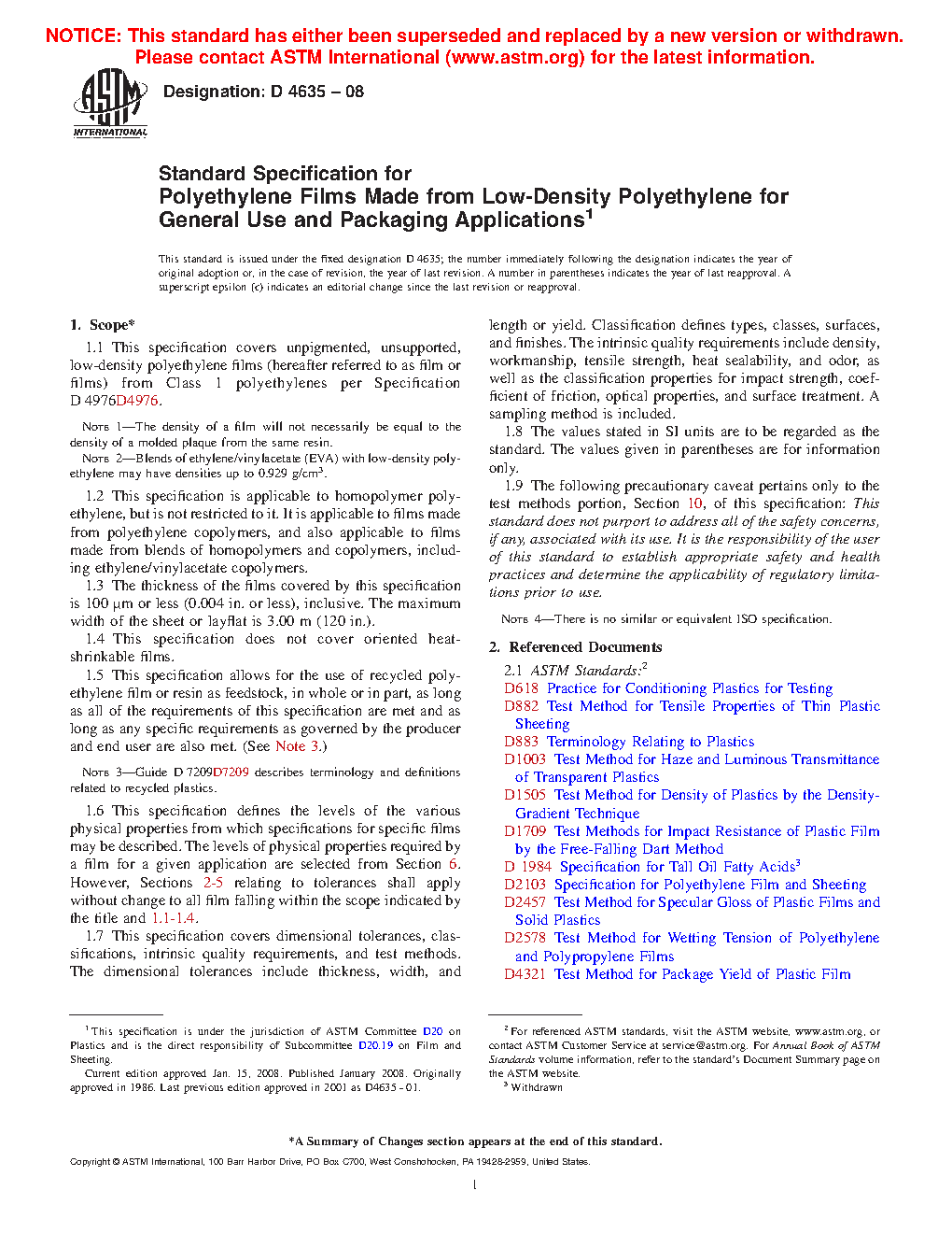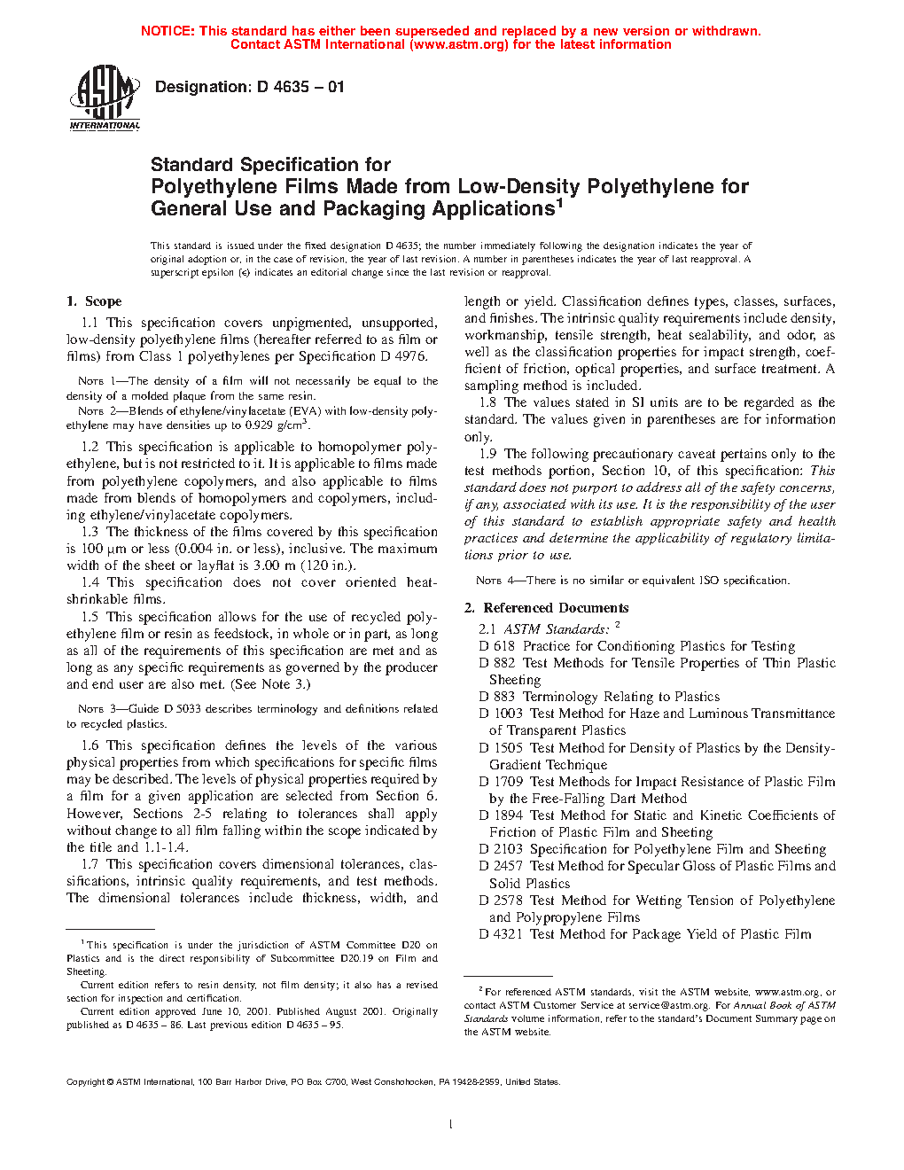 1.1 This specification covers unpigmented, unsupported, low-density polyethylene and linear low-density polyethylene films (hereafter referred to as film or films) with densities ranging from 0.910-0.925 g/cm3 per Specification D4976.