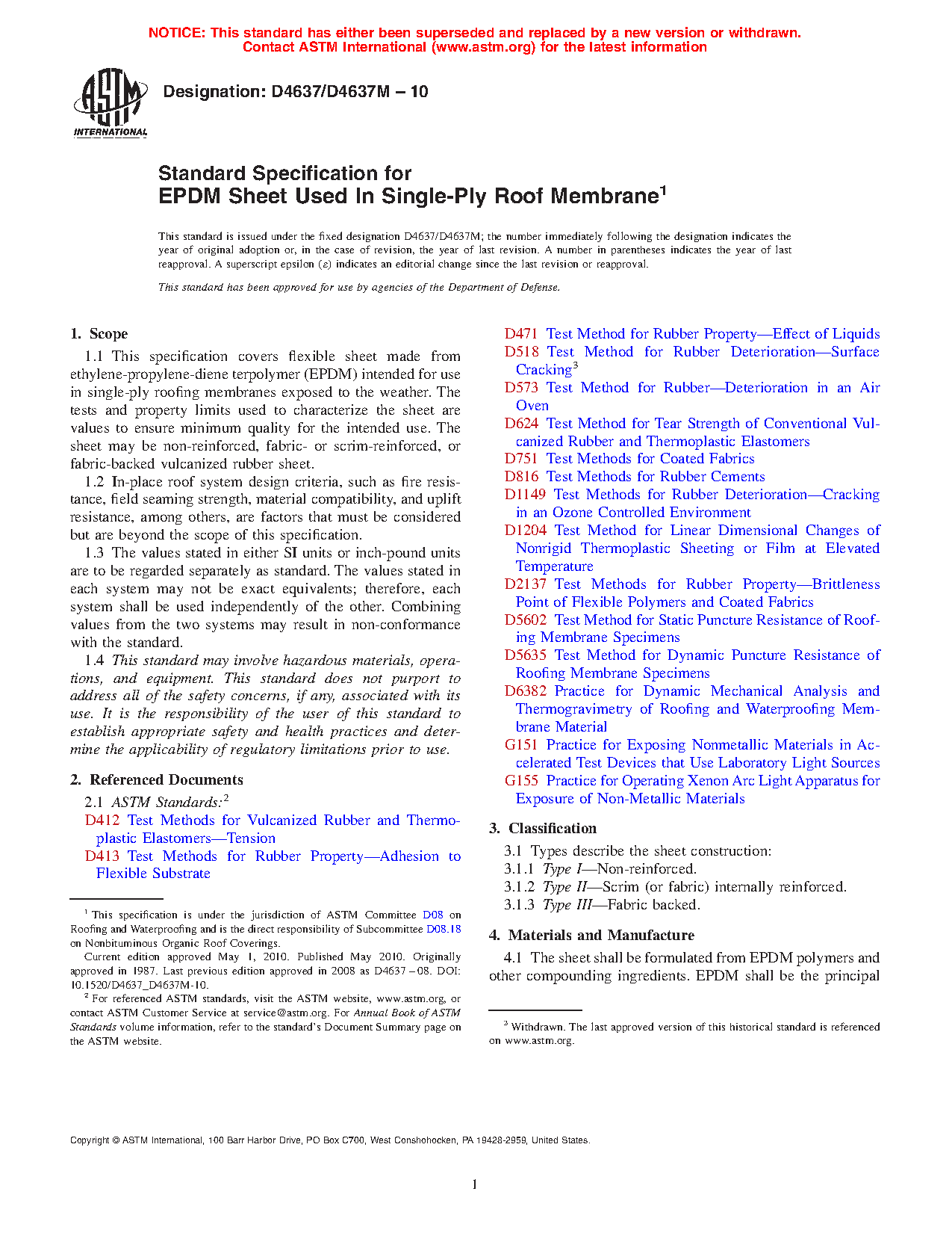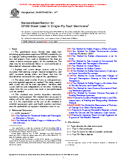 This specification covers flexible sheet made from ethylene-propylene-diene terpolymer (EPDM) intended for use in single-ply roofing membranes exposed to the weather. The rubber sheet may be non-reinforced (Type I), fabric or scrim internally reinforced (Type II), or fabric-backed (Type III) vulcanized. In-place roof system design criteria, such as fire resistance, field seaming strength, material compatibility, and uplift resistance, among others, are beyond the scope of this specification. The physical requirements for which flexible sheets shall be tested on and accordingly conform to are as follows: sheet-overall and coating over scrim or fabric thicknesses; breaking strength; tensile strength and set; dynamic and static puncture resistance; ultimate elongation and elongation at fabric break; tear resistance and strength; brittleness point; ozone resistance; behavior upon heat aging; linear dimensional change; water absorption; factory seam strength; weather resistance; and fabric adhesion.