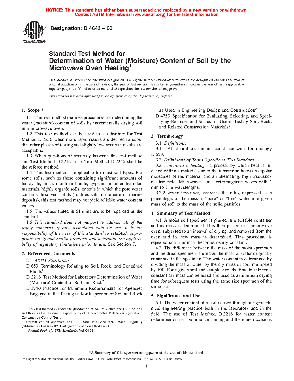 The water content of a soil is used throughout geotechnical engineering practice both in the laboratory and in the field. The use of Test Method D 2216