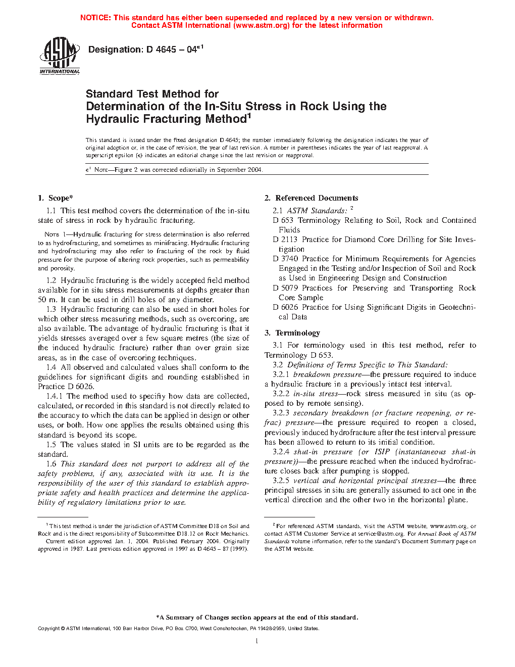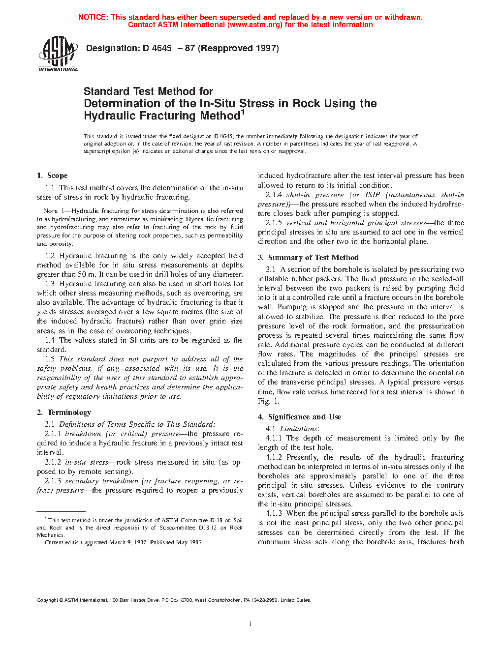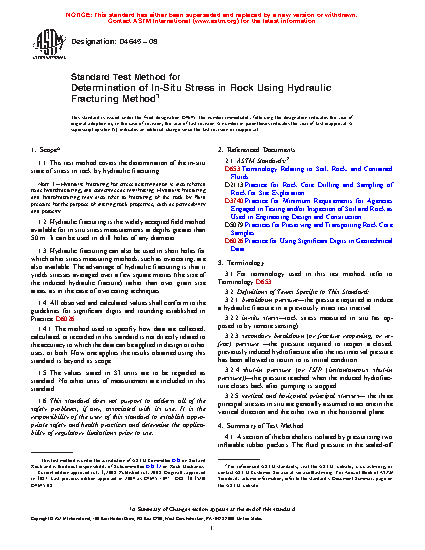 1.1 This test method covers the determination of the in-situ state of stress in rock by hydraulic fracturing. Note 1Hydraulic fracturing for stress determination is also referred to as hydrofracturing, and sometimes as minifracing. Hydraulic fracturing and hydrofracturing may also refer to fracturing of the rock by fluid pressure for the purpose of altering rock properties, such as permeability and porosity.