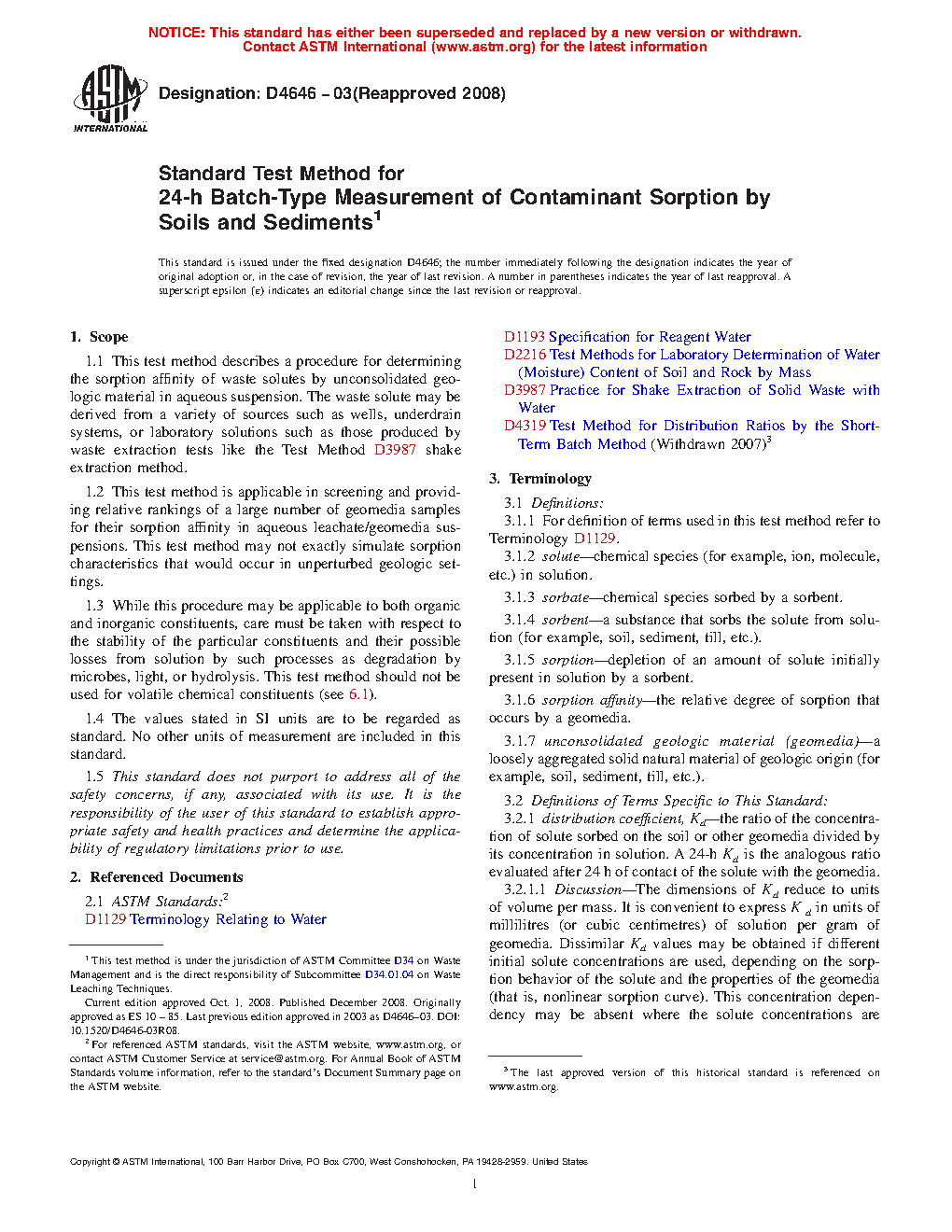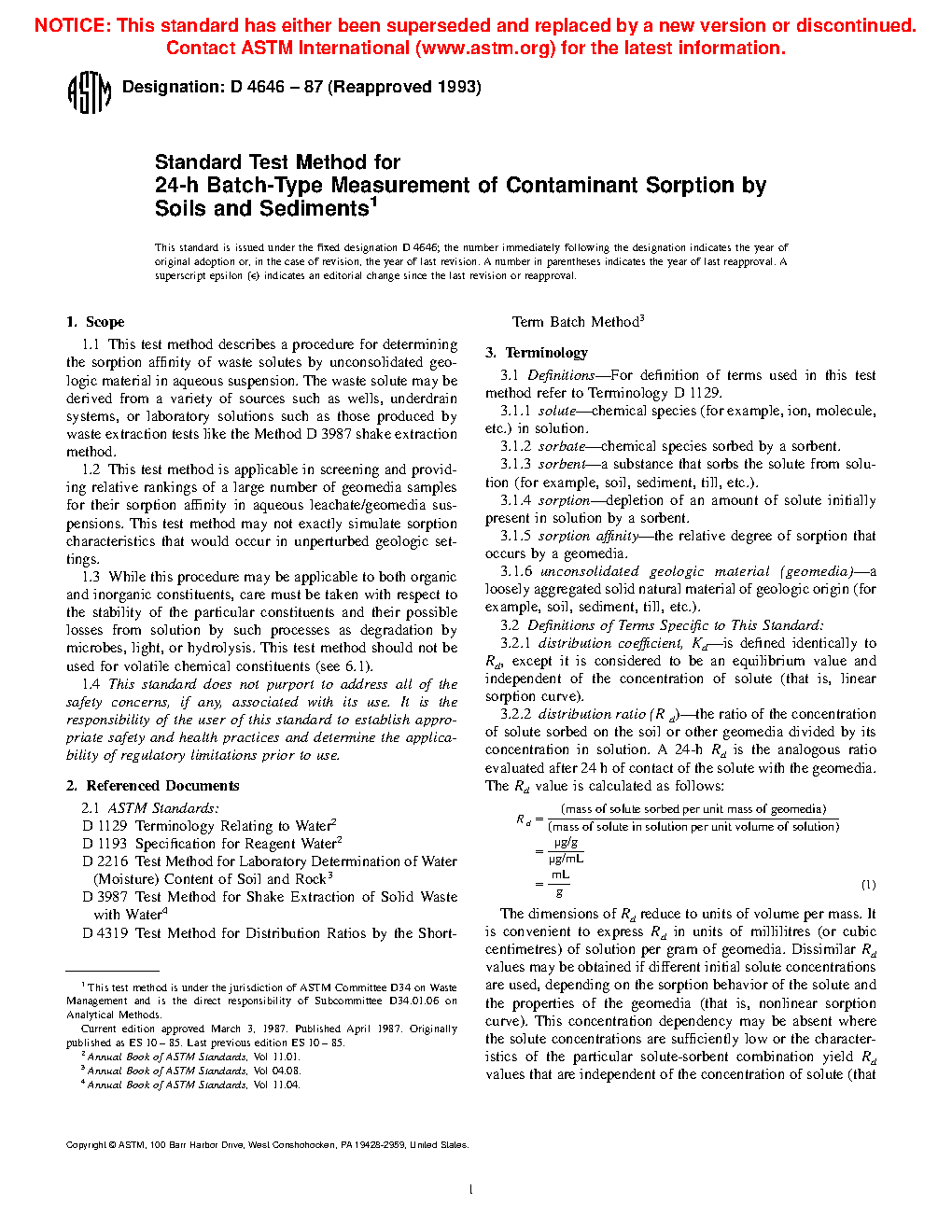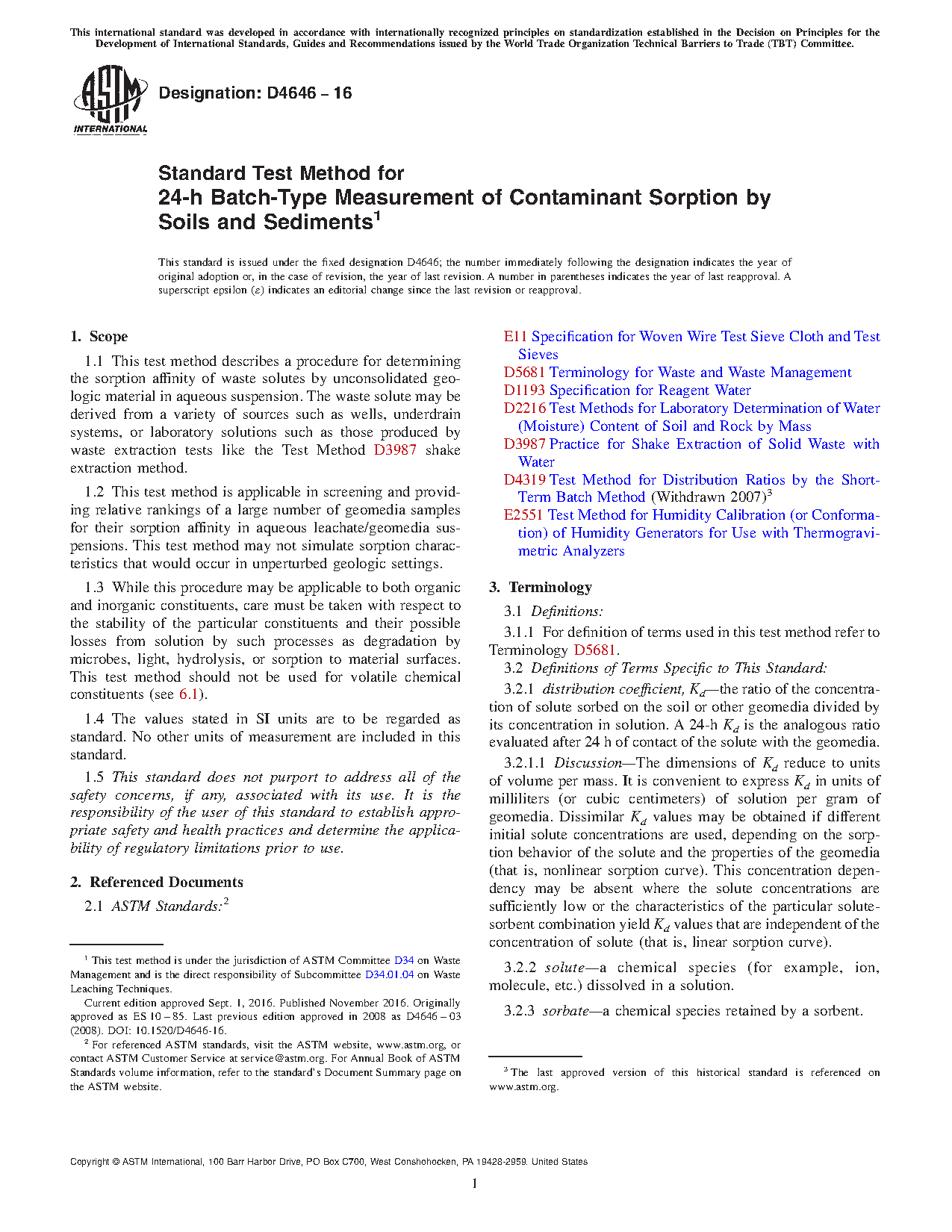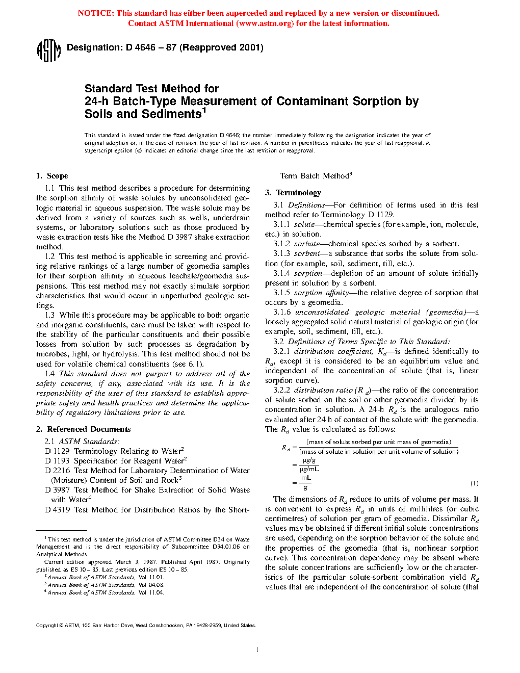 This test method is meant to allow for a rapid (24 h) index of a geomedia’sorption affinity for given chemicals or leachate constituents. A large number of samples may be run using this test method to determine a comparative ranking of those samples, based upon the amount of solute sorbed by the geomedia, or by various geomedia or leachate constituents. The 24-h time is used to make the test convenient and also to minimize microbial degradation which may be a problem in longer-timed procedures. While Kd values are directly applicable for screening and comparative ranking purposes, their use in predictive field applications generally requires the assumption that Kd be a fixed value.