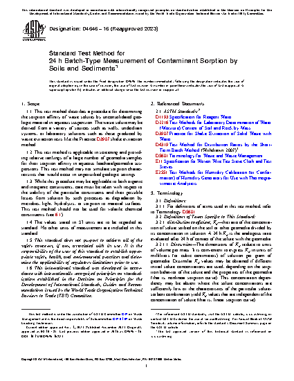 1.1 This test method describes a procedure for determining the sorption affinity of waste solutes by unconsolidated geologic material in aqueous suspension. The waste solute may be derived from a variety of sources such as wells, underdrain systems, or laboratory solutions such as those produced by waste extraction tests like the Method D3987 shake extraction method.