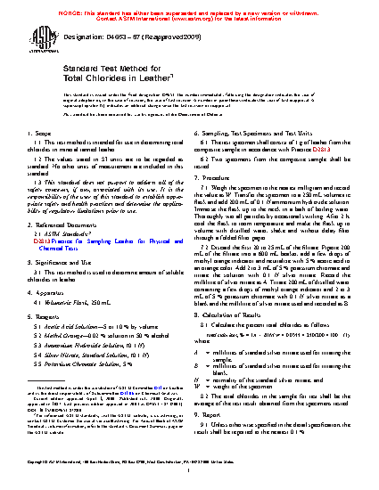 1.1 This test method is intended for use in determining total chlorides in mineral tanned leather.