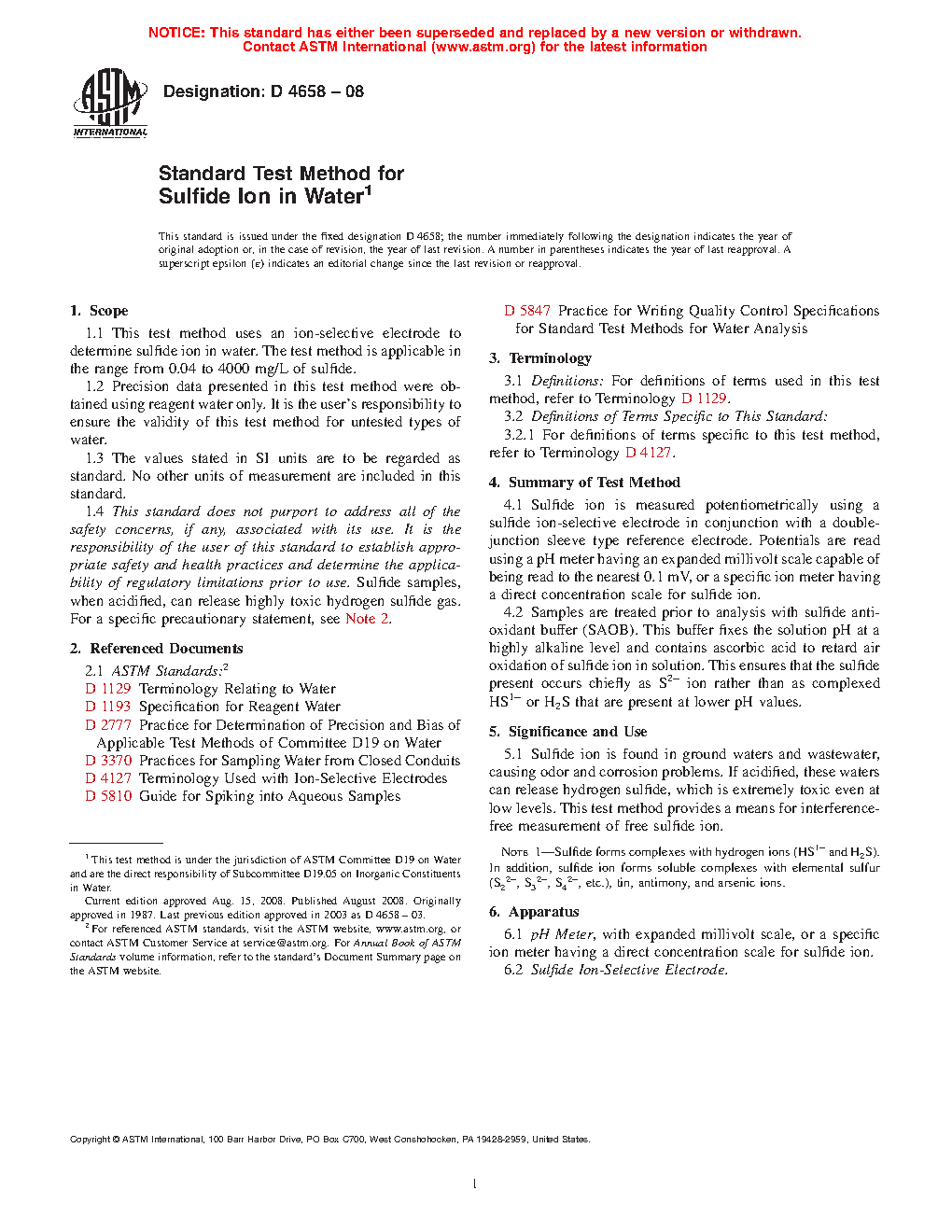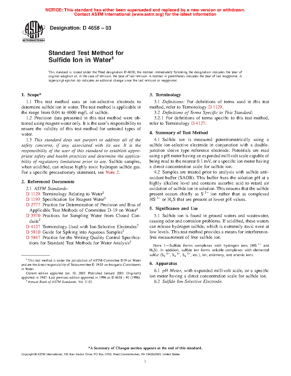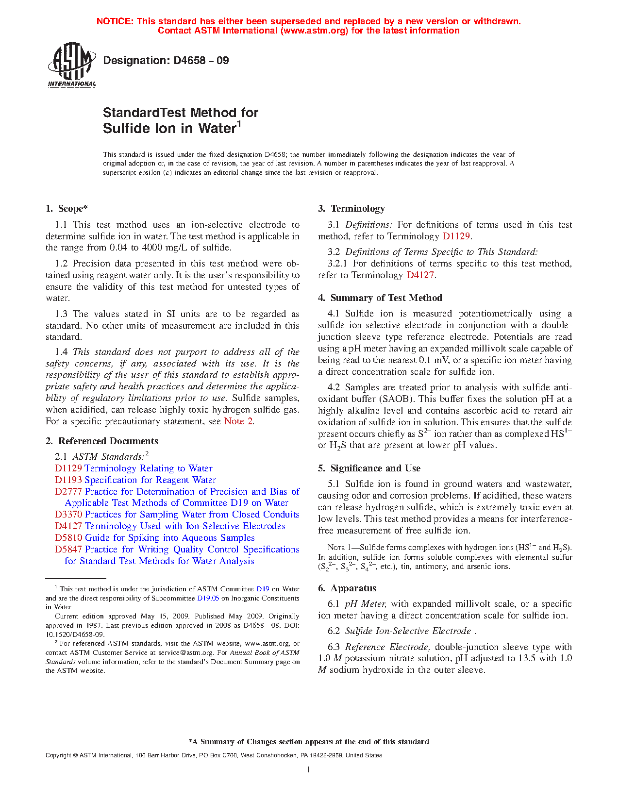 1.1 This test method uses an ion-selective electrode to determine sulfide ion in water. The test method is applicable in the range from 0.04 to 4000 mg/L of sulfide.