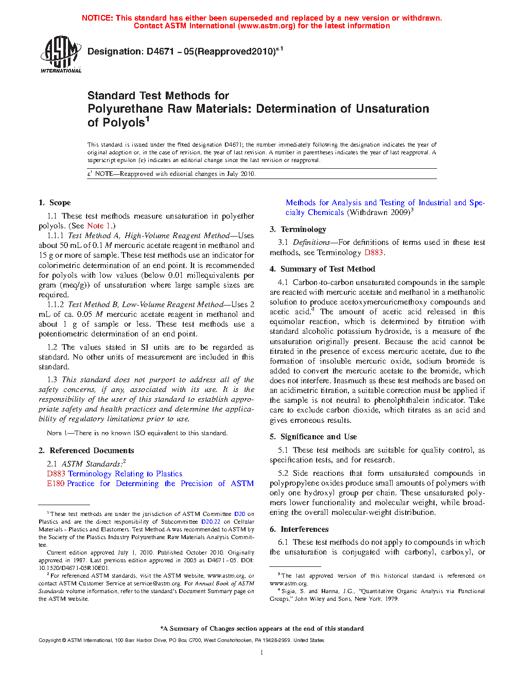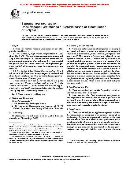1.1 This test method measures unsaturation in polyether polyols. (See Note 1.) It uses 2 mL of ca. 0.05 M mercuric acetate reagent in methanol and about 1 g of sample or less. This test method uses a potentiometric determination of an end point.