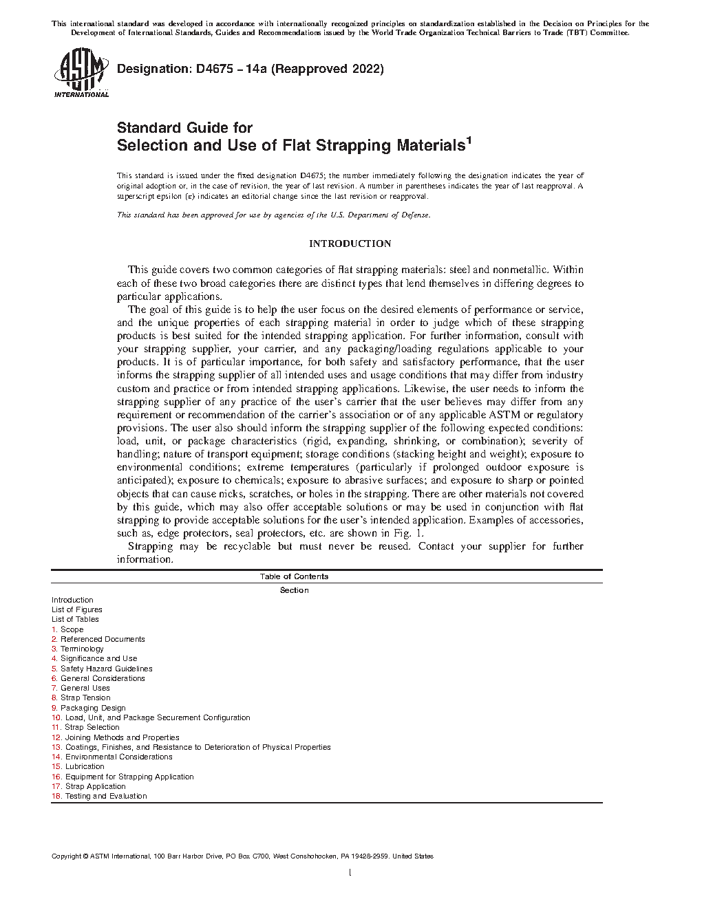 1.1 This guide1 covers information on flat strapping materials (steel and nonmetallic) for the prospective user wanting initial guidance in selecting a strapping material and information on suggested application methods for use in packaging (closing, reinforcing, baling, bundling, unitizing, or palletizing), and loading applications (load unitization and securement to transport vehicle). The use applies to handling, securement, storage, and distribution systems.
