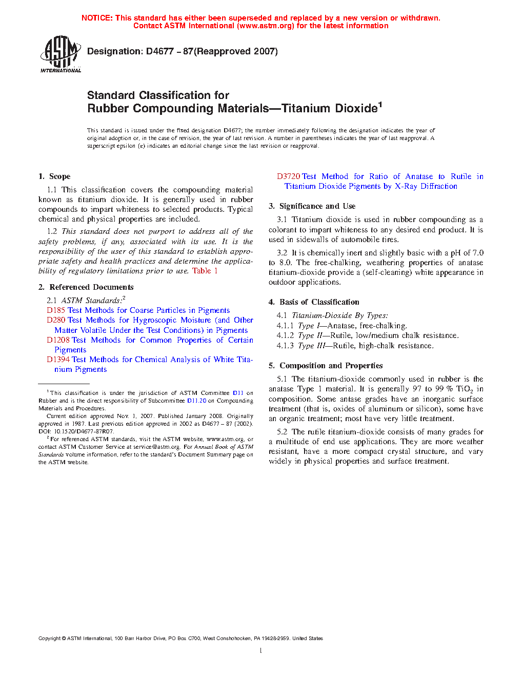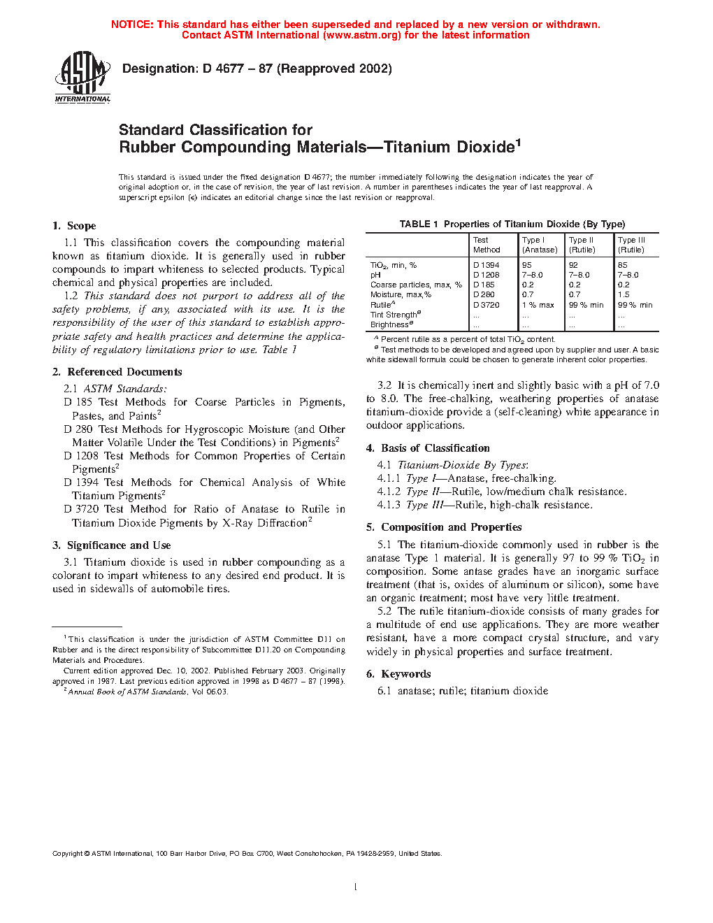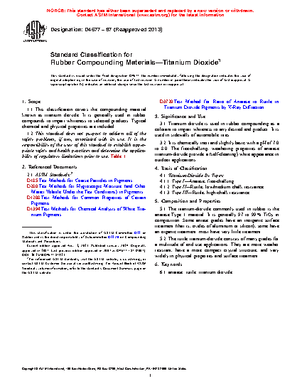 1.1 This classification covers the compounding material known as titanium dioxide. It is generally used in rubber compounds to impart whiteness to selected products. Typical chemical and physical properties are included.