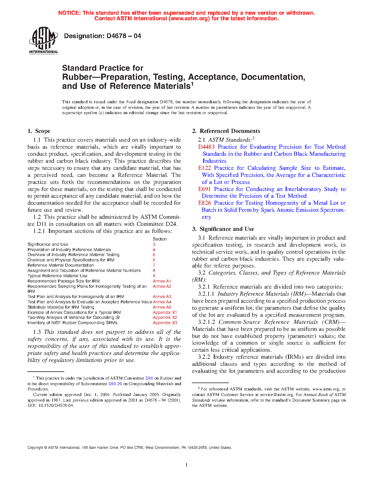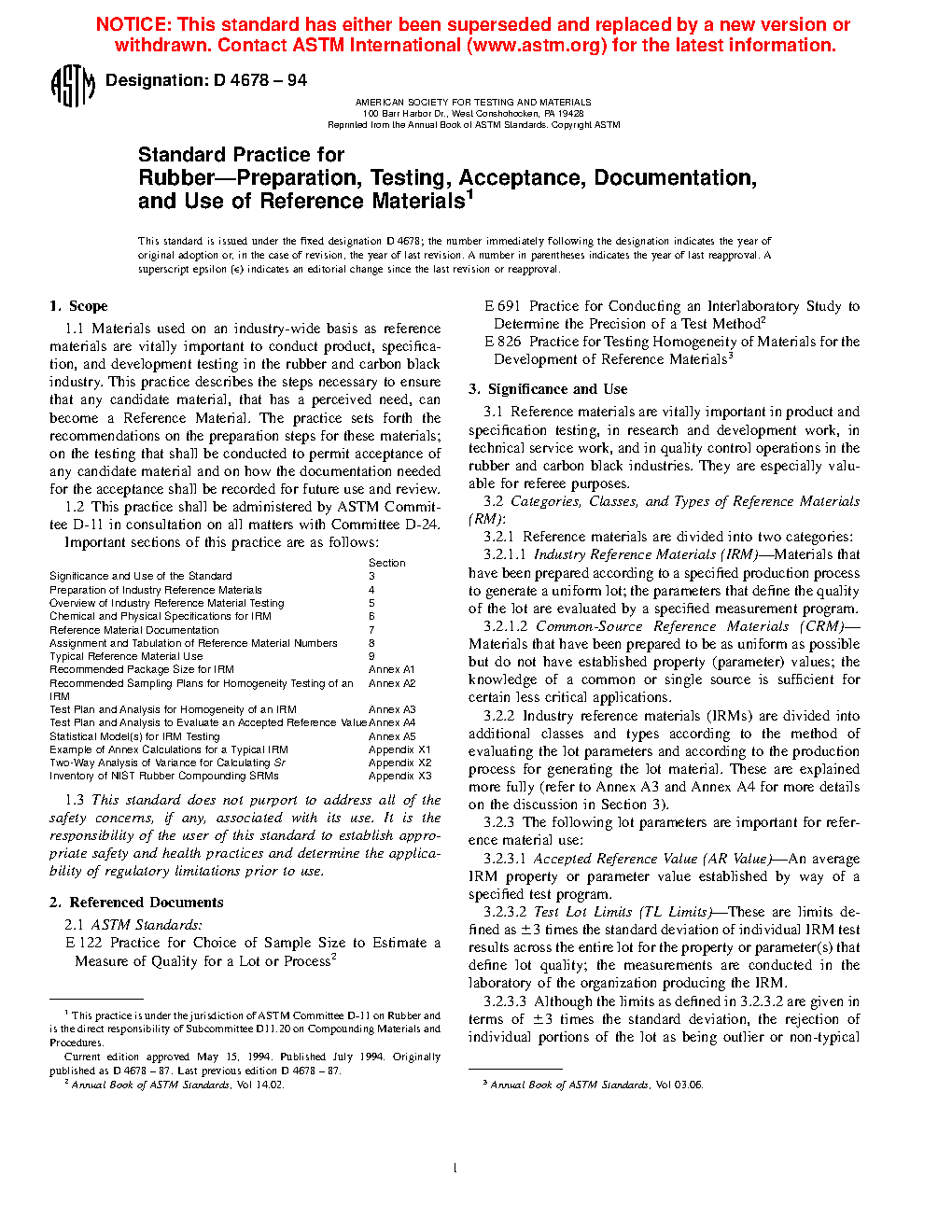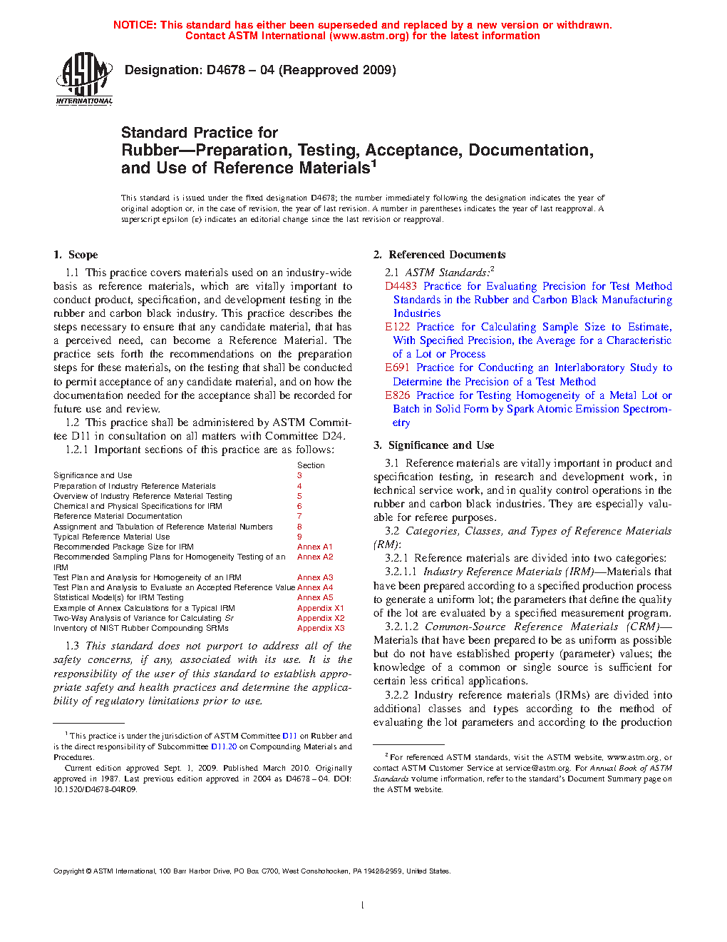 1.1 This practice covers materials used on an industry-wide basis as reference materials, which are vitally important to conduct product, specification, and development testing in the rubber industry. This practice describes the steps necessary to ensure that any candidate material, that has a perceived need, can become a Reference Material. The practice sets forth the recommendations on the preparation steps for these materials, on the testing that shall be conducted to permit acceptance of any candidate material, and on how the documentation needed for the acceptance shall be recorded for future use and review.
