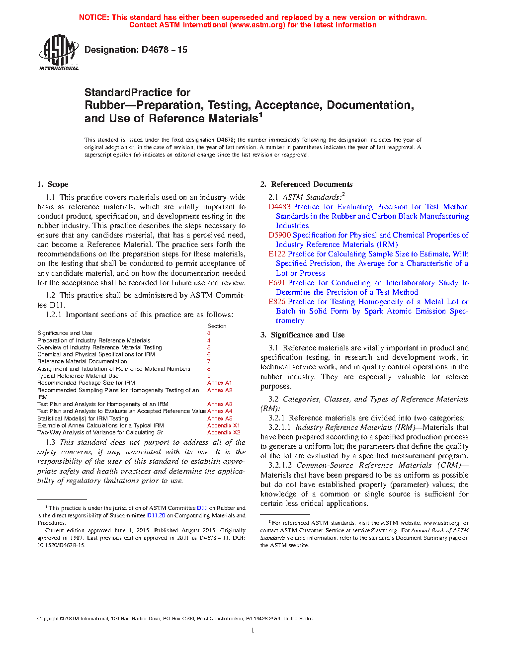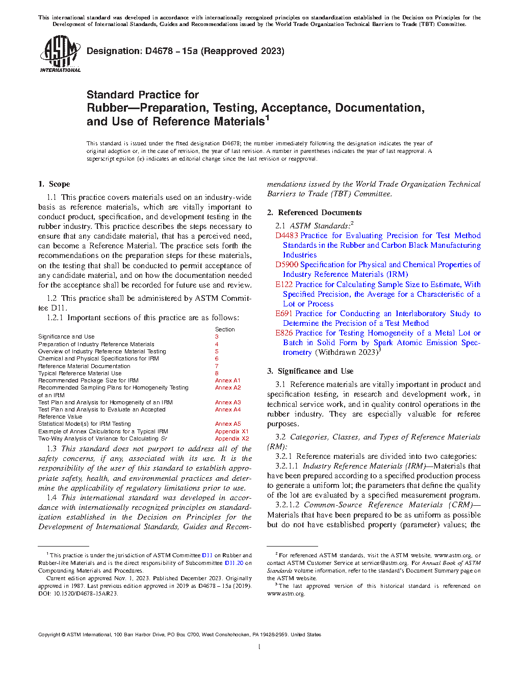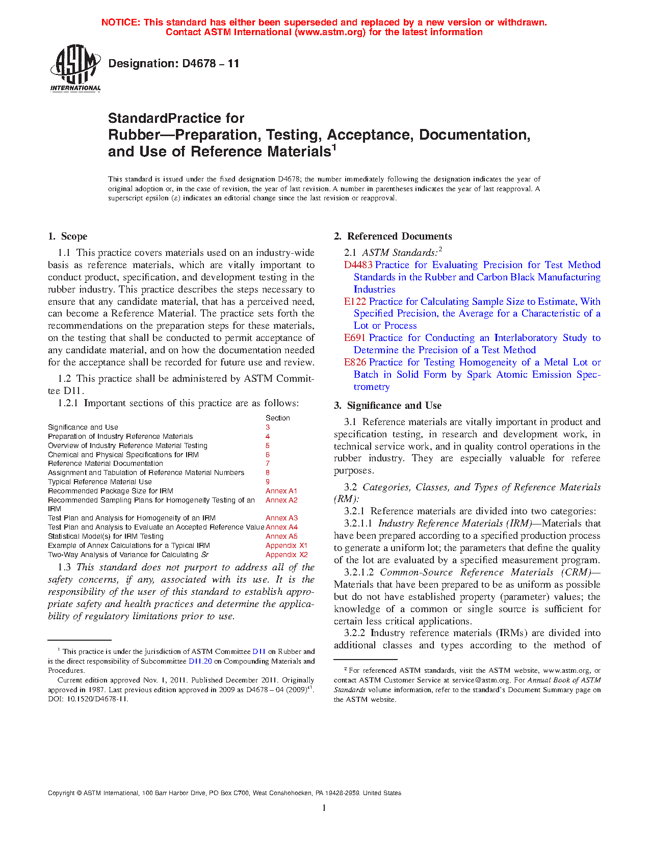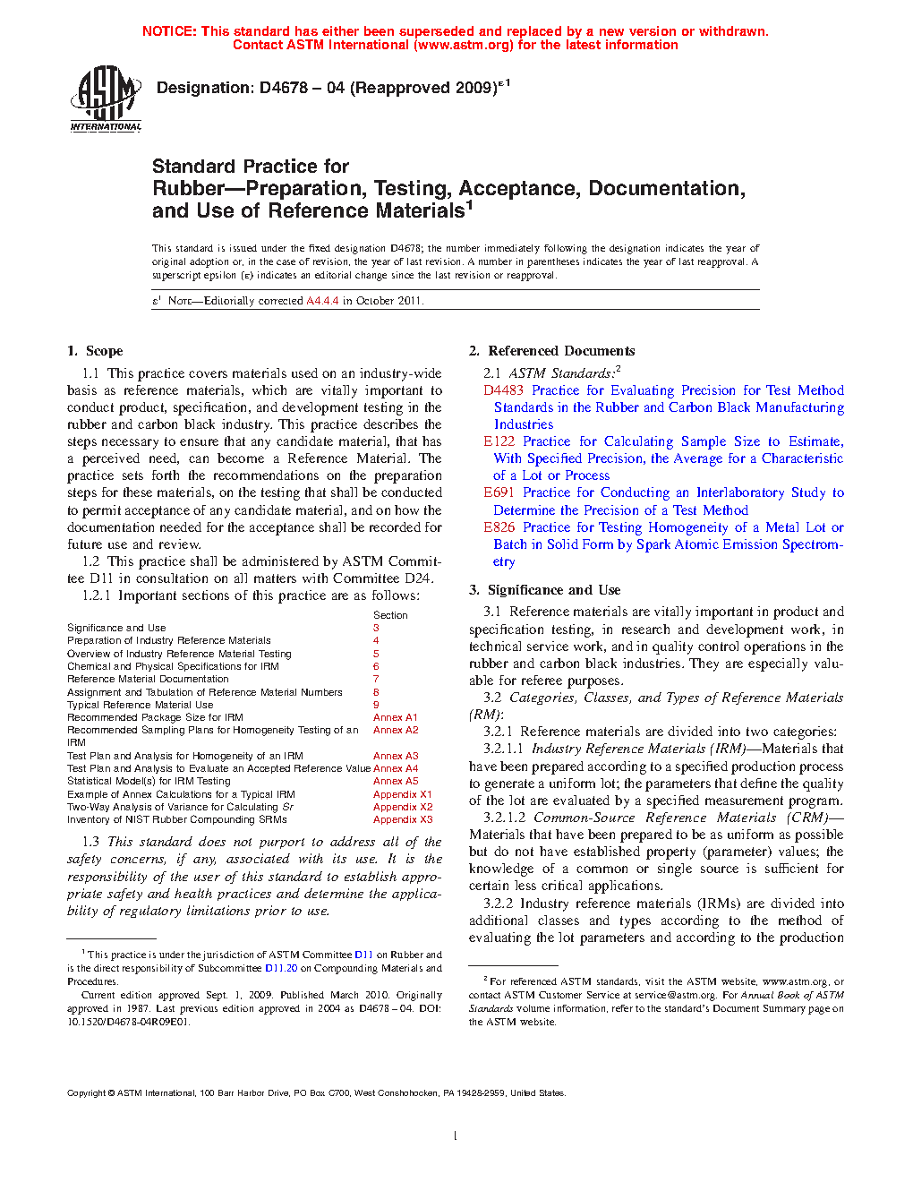 1.1 This practice covers materials used on an industry-wide basis as reference materials, which are vitally important to conduct product, specification, and development testing in the rubber industry. This practice describes the steps necessary to ensure that any candidate material, that has a perceived need, can become a Reference Material. The practice sets forth the recommendations on the preparation steps for these materials, on the testing that shall be conducted to permit acceptance of any candidate material, and on how the documentation needed for the acceptance shall be recorded for future use and review.