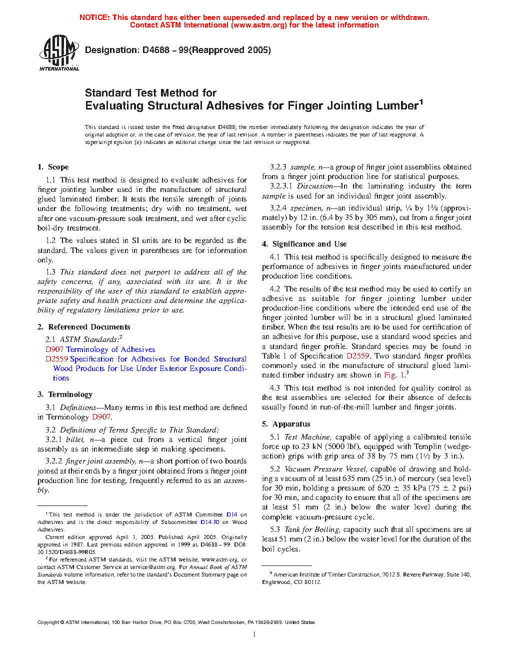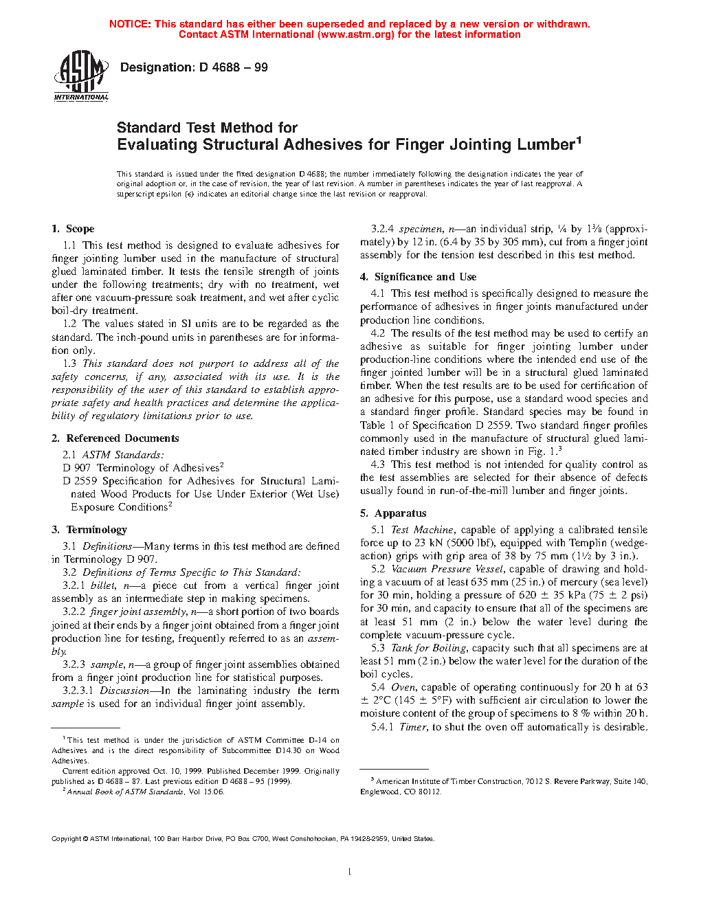 4.2 The results of the test method may be used to certify an adhesive as suitable for finger jointing lumber under production-line conditions where the intended end use of the finger jointed lumber will be in a structural glued laminated timber. When the test results are to be used for certification of an adhesive for this purpose, use a standard wood species and a standard finger profile. Standard species may be found in Table 1 of Specification D2559. Two standard finger profiles commonly used in the manufacture of structural glued laminated timber industry are shown in Fig. 1.3