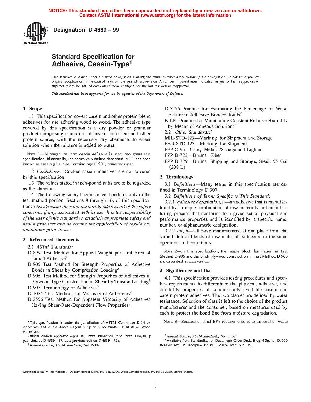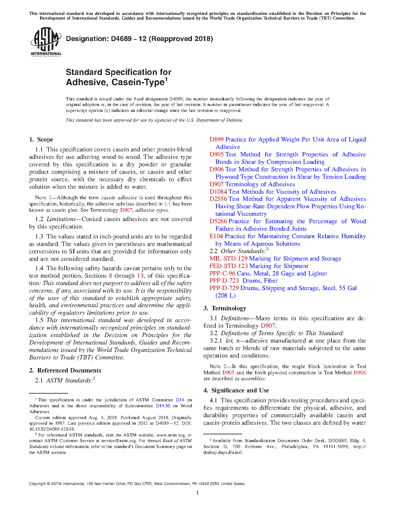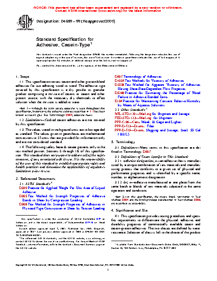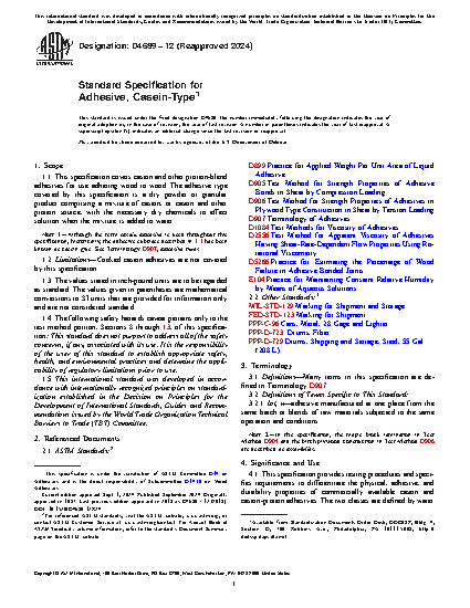 1.1 This specification covers casein and other protein-blend adhesives for use adhering wood to wood. The adhesive type covered by this specification is a dry powder or granular product comprising a mixture of casein, or casein and other protein source, with the necessary dry chemicals to effect solution when the mixture is added to water.