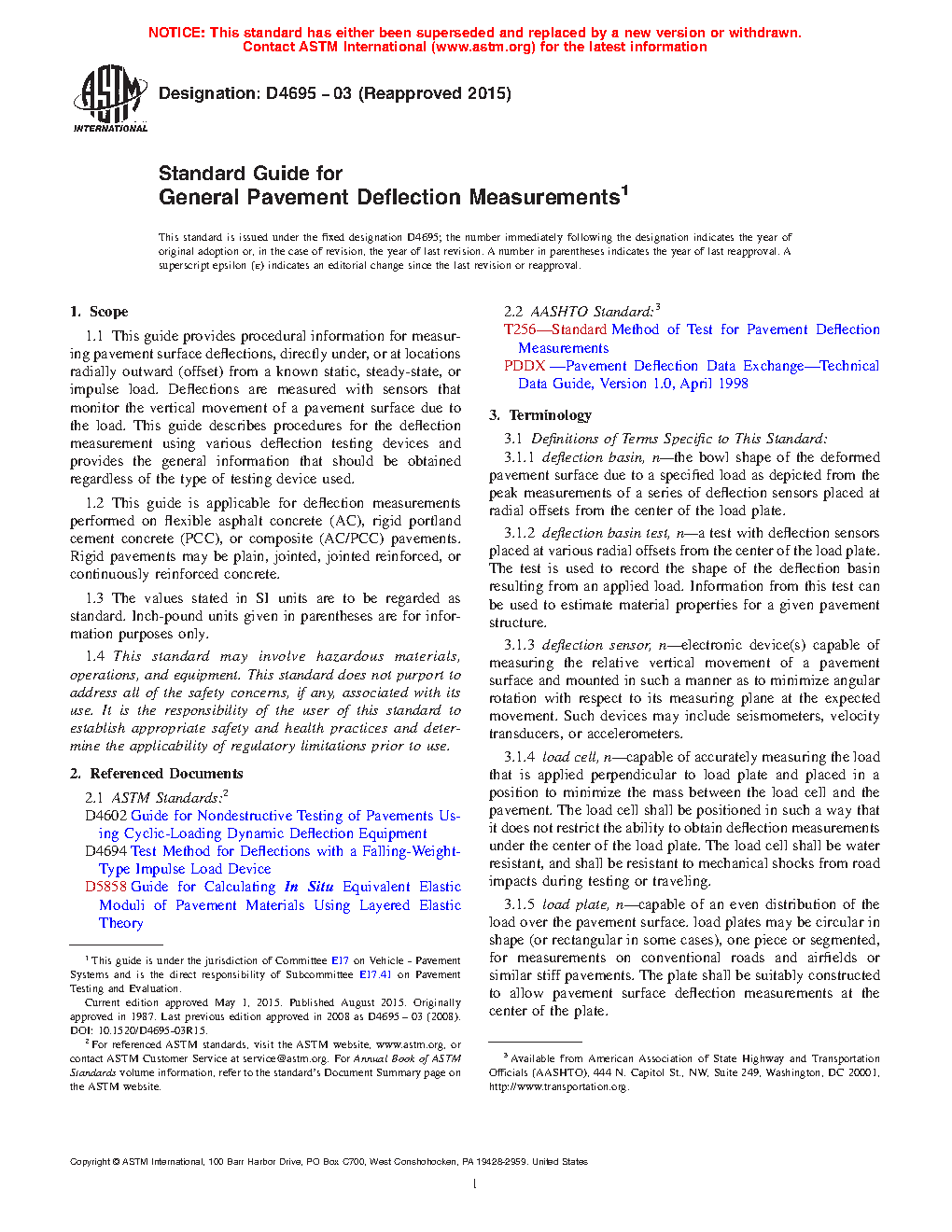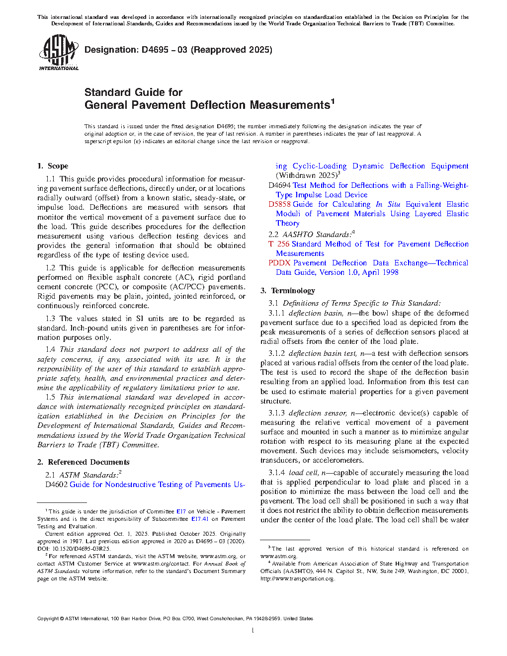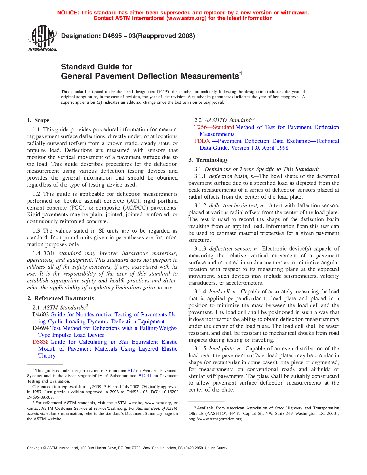 1.1 This guide provides procedural information for measuring pavement surface deflections, directly under, or at locations radially outward (offset) from a known static, steady-state, or impulse load. Deflections are measured with sensors that monitor the vertical movement of a pavement surface due to the load. This guide describes procedures for the deflection measurement using various deflection testing devices and provides the general information that should be obtained regardless of the type of testing device used.
