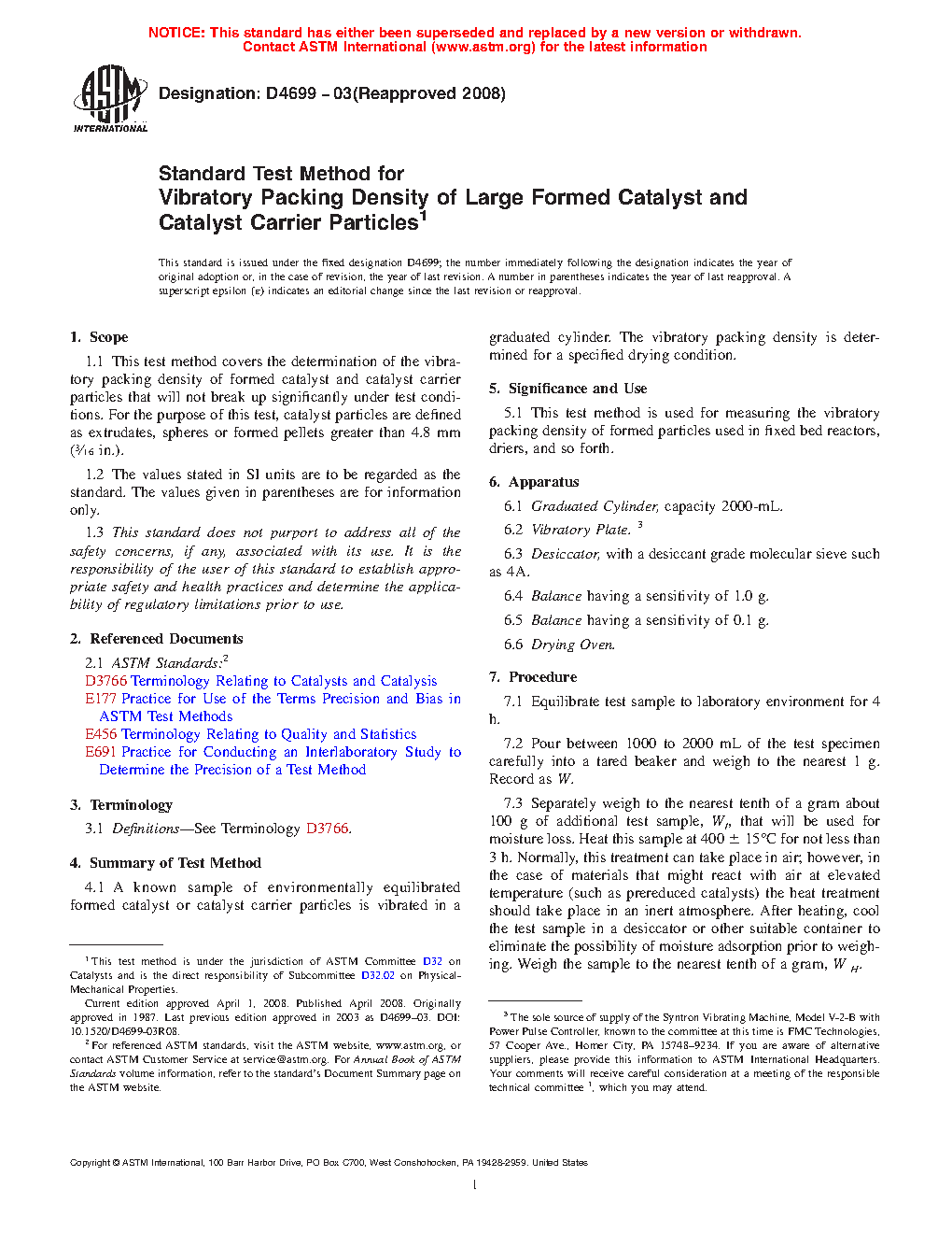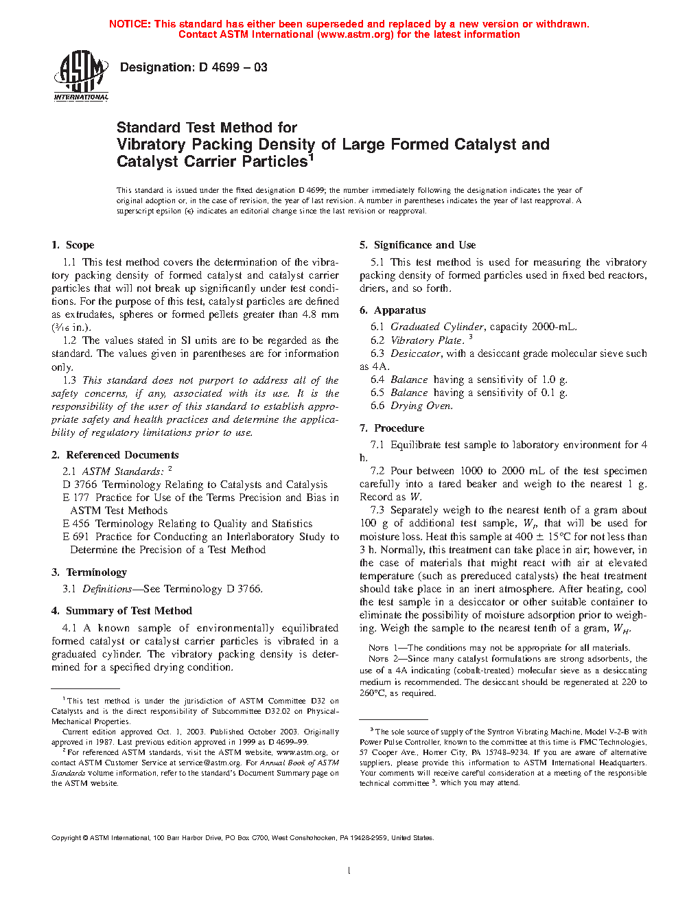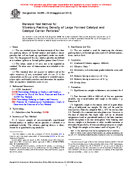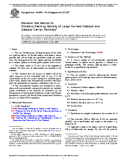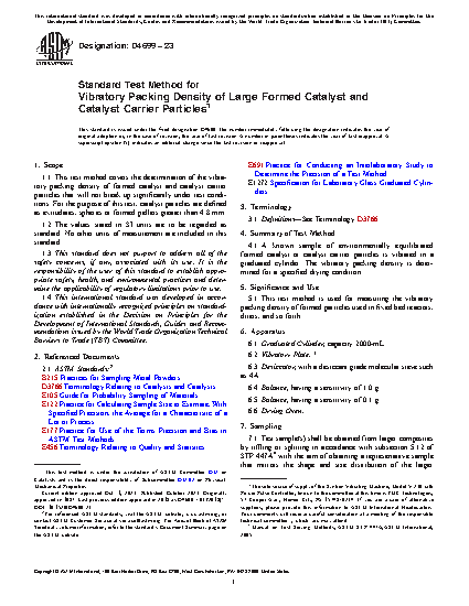 1.1 This test method covers the determination of the vibratory packing density of formed catalyst and catalyst carrier particles that will not break up significantly under test conditions. For the purpose of this test, catalyst particles are defined as extrudates, spheres or formed pellets greater than 4.8 mm ( 3/16 in.).