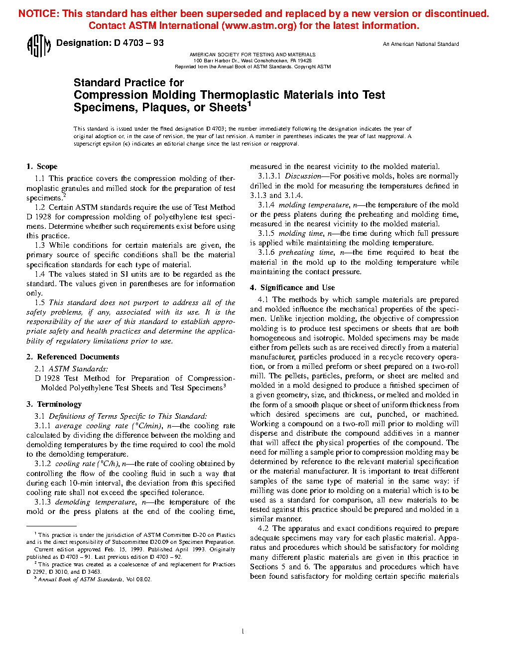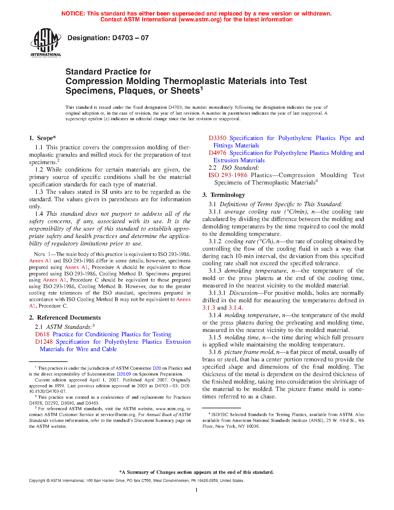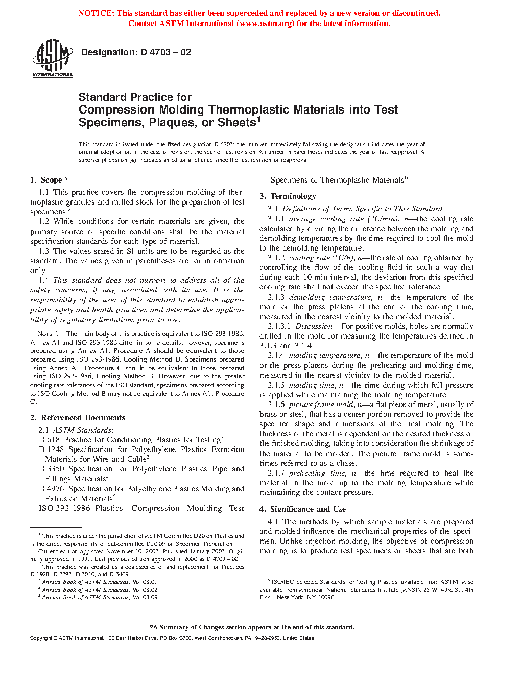 Note 1—The main body of this practice is equivalent to ISO 293-1986. Annex A1 and ISO 293-1986 differ in some details; however, specimens prepared using Annex A1, Procedure A should be equivalent to those prepared using ISO 293-1986, Cooling Method D. Specimens prepared using Annex A1, Procedure C should be equivalent to those prepared using ISO 293-1986, Cooling Method B. However, due to the greater cooling rate tolerances of the ISO standard, specimens prepared according to ISO Cooling Method B may not be equivalent to Annex A1, Procedure C.