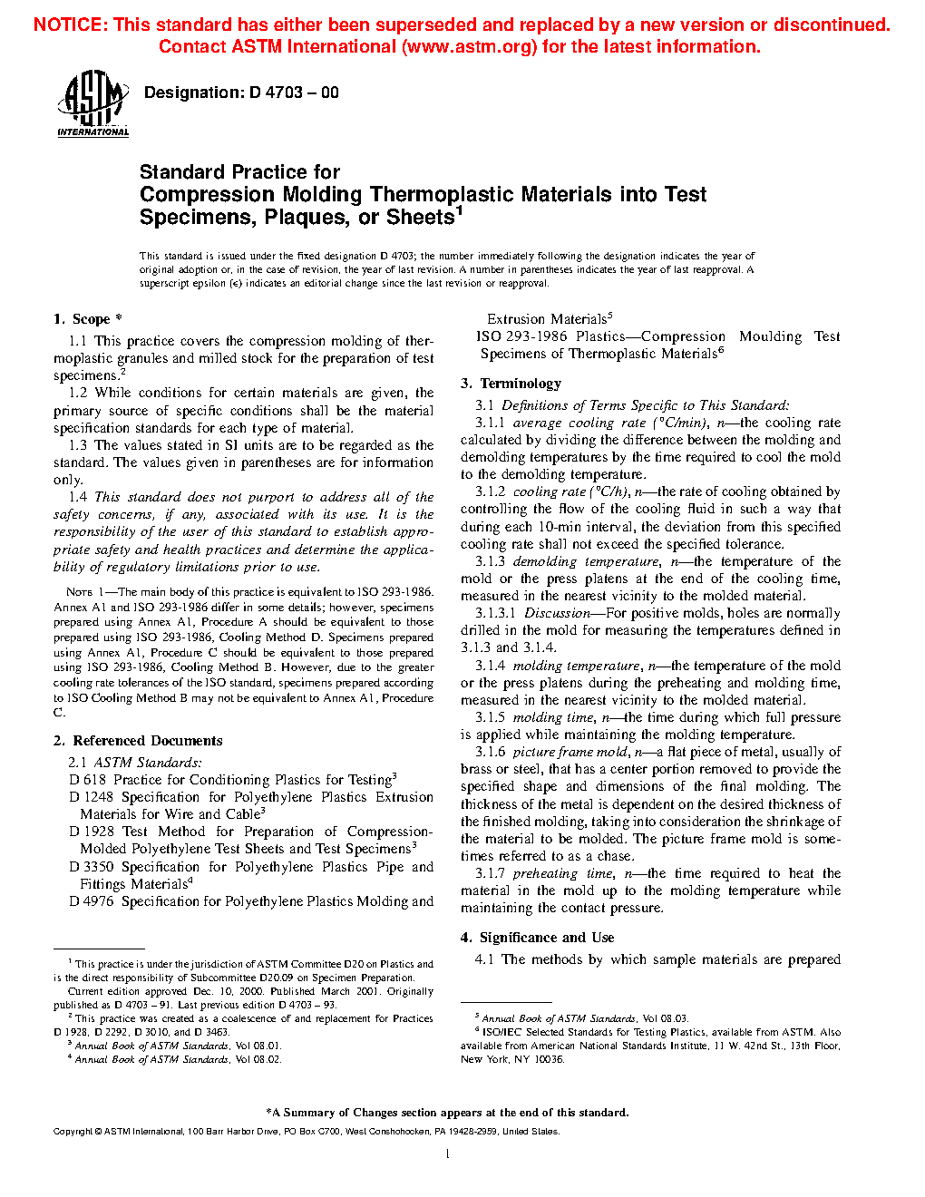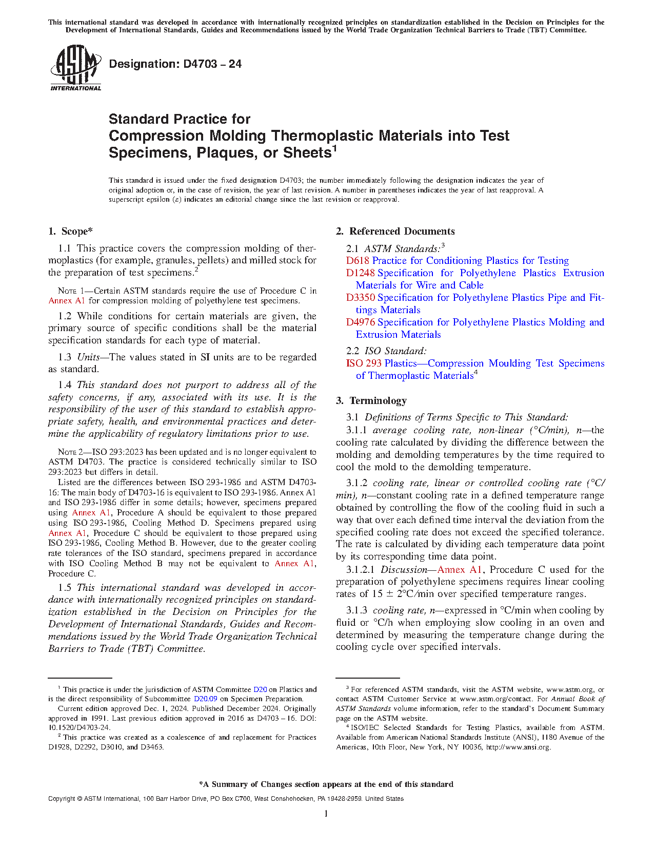 Note 1: The main body of this practice is equivalent to ISO 293-1986. Annex A1 and ISO 293-1986 differ in some details; however, specimens prepared using Annex A1, Procedure A should be equivalent to those prepared using ISO 293-1986, Cooling Method D. Specimens prepared using Annex A1, Procedure C should be equivalent to those prepared using ISO 293-1986, Cooling Method B. However, due to the greater cooling rate tolerances of the ISO standard, specimens prepared in accordance with ISO Cooling Method B may not be equivalent to Annex A1, Procedure C.