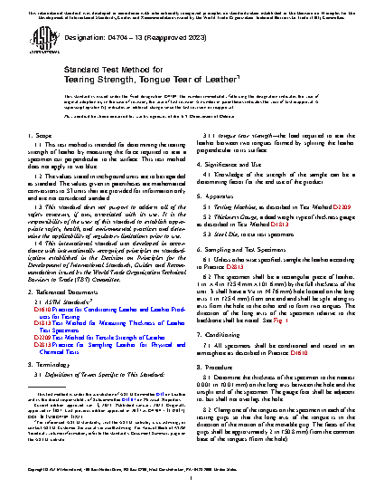 1.1 This test method is intended for determining the tearing strength of leather by measuring the force required to tear a specimen cut perpendicular to the surface. This test method does not apply to wet blue.