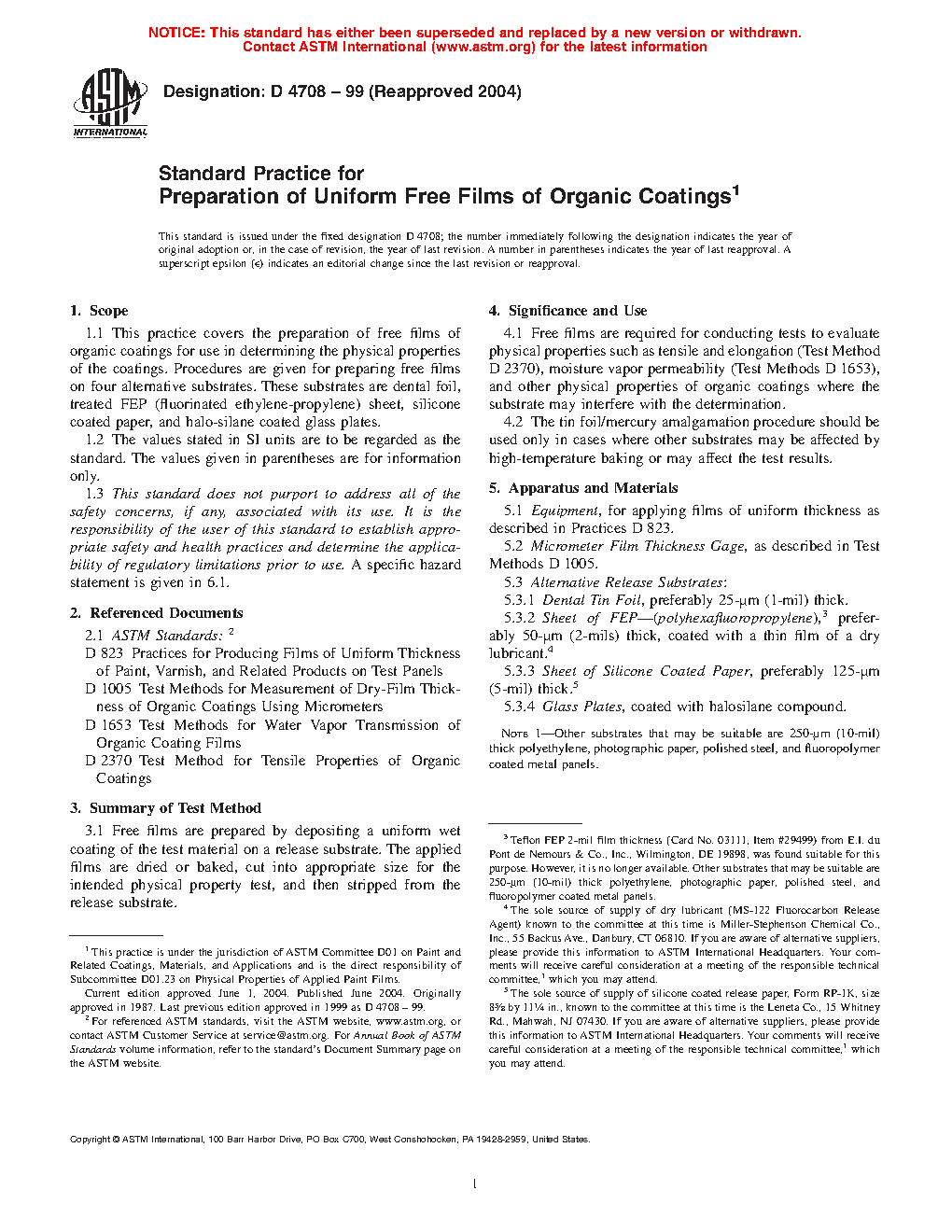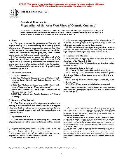 1.1 This practice covers the preparation of free films of organic coatings for use in determining the physical properties of the coatings. Procedures are given for preparing free films on three alternative substrates. These substrates are treated FEP (fluorinated ethylene-propylene) sheet, silicone coated paper, and halosilane coated glass plates.