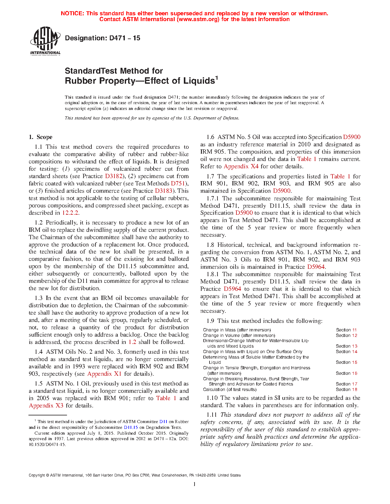 1.5 ASTM No. 1 Oil, previously used in this test method as a standard test liquid, is no longer commercially available and in 2005 was replaced with IRM 901; refer to Table 1 and Appendix X3 for details.