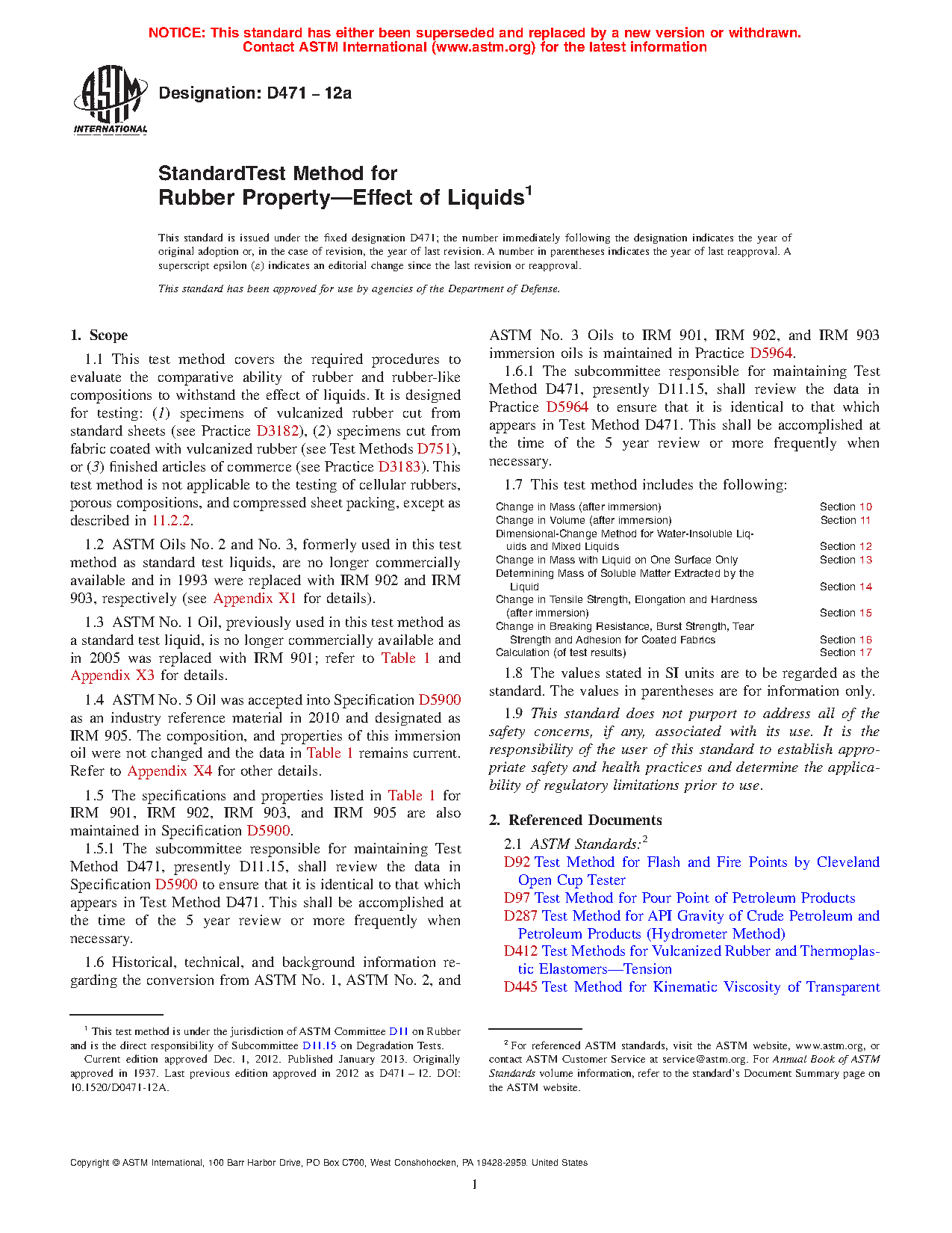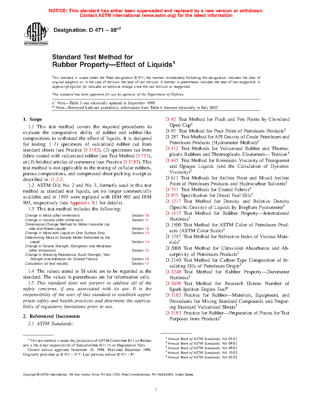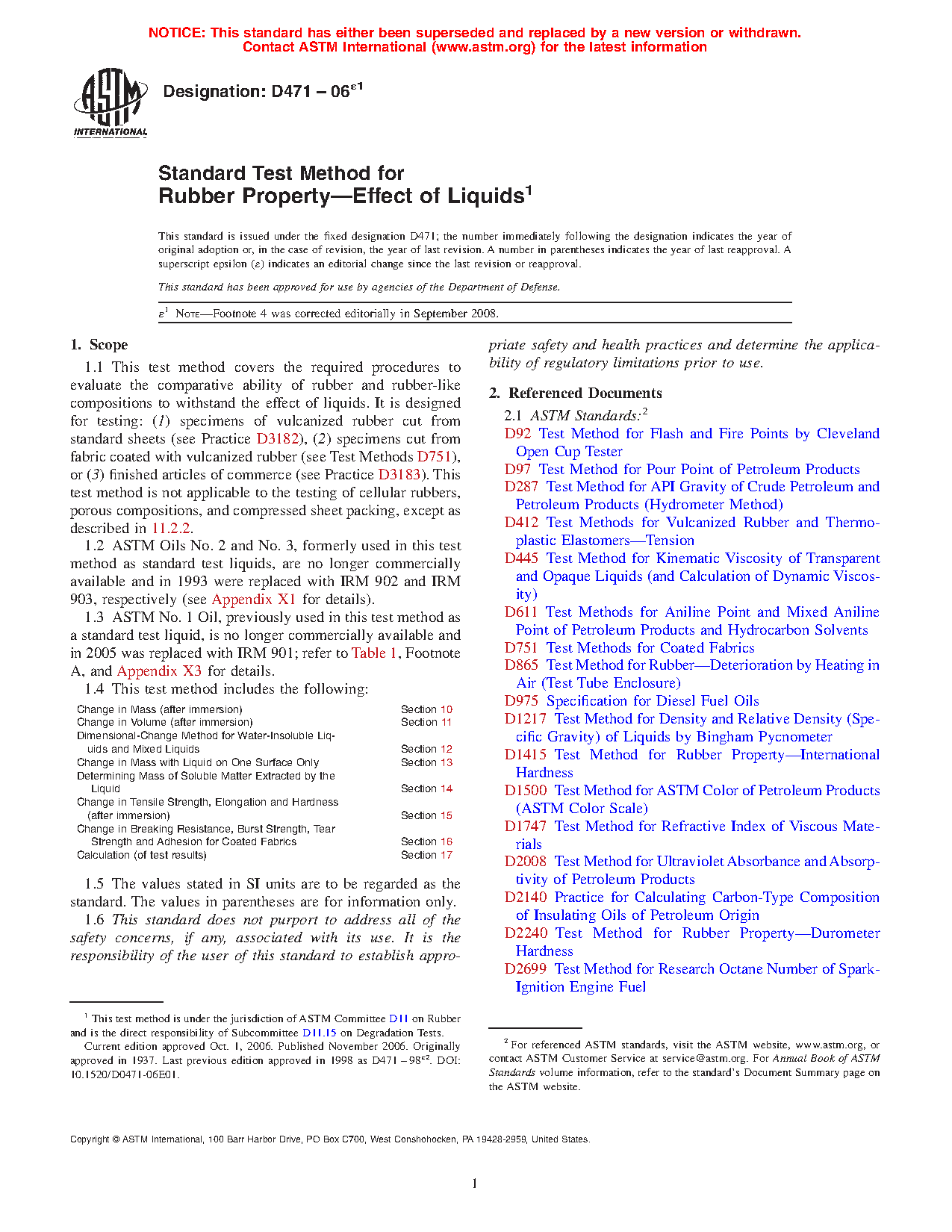 1.1 This test method covers the required procedures to evaluate the comparative ability of rubber and rubber-like compositions to withstand the effect of liquids. It is designed for testing: (1) specimens of vulcanized rubber cut from standard sheets (see Practice D3182), (2) specimens cut from fabric coated with vulcanized rubber (see Test Methods D751), or (3) finished articles of commerce (see Practice D3183). This test method is not applicable to the testing of cellular rubbers, porous compositions, and compressed sheet packing, except as described in 12.2.2.
