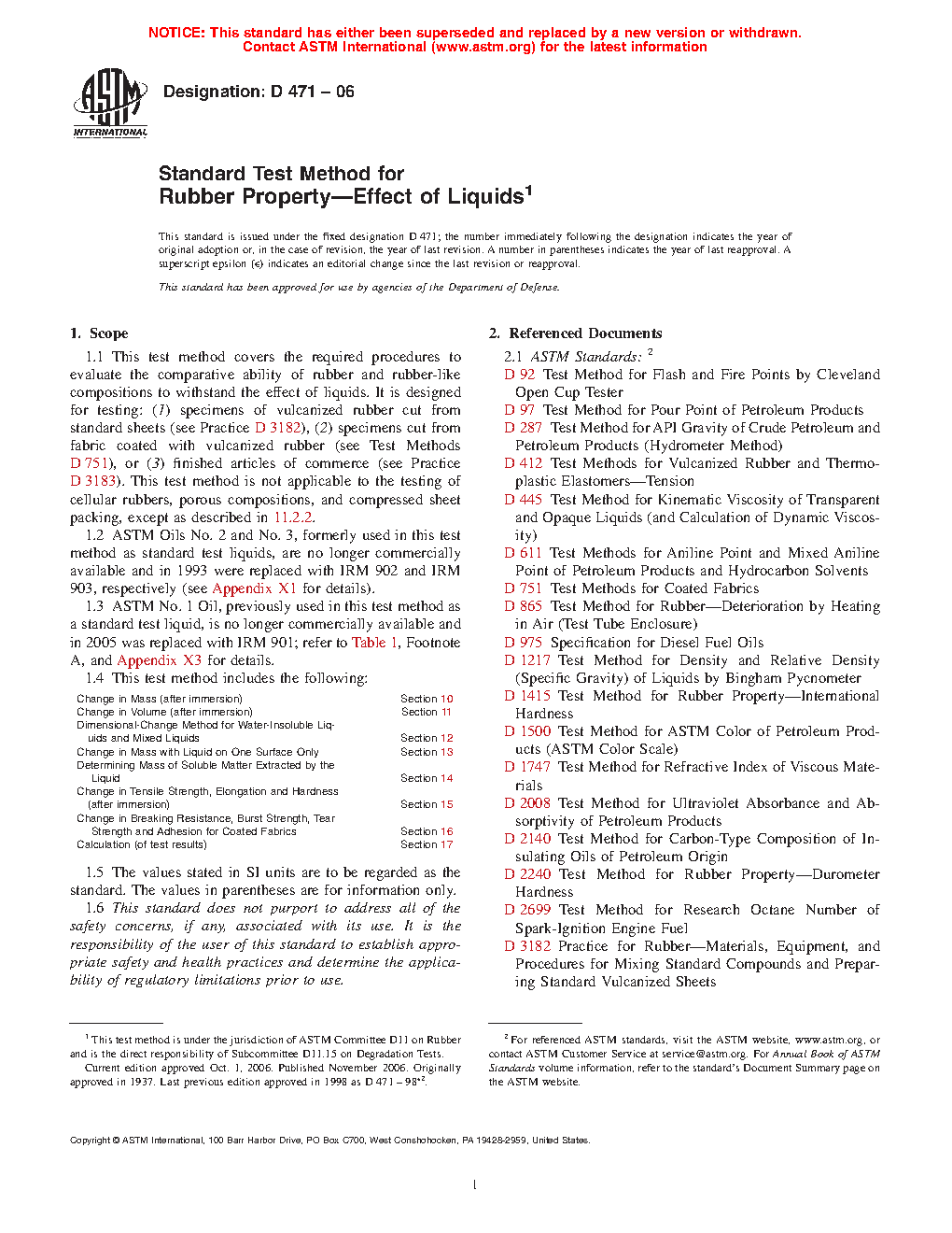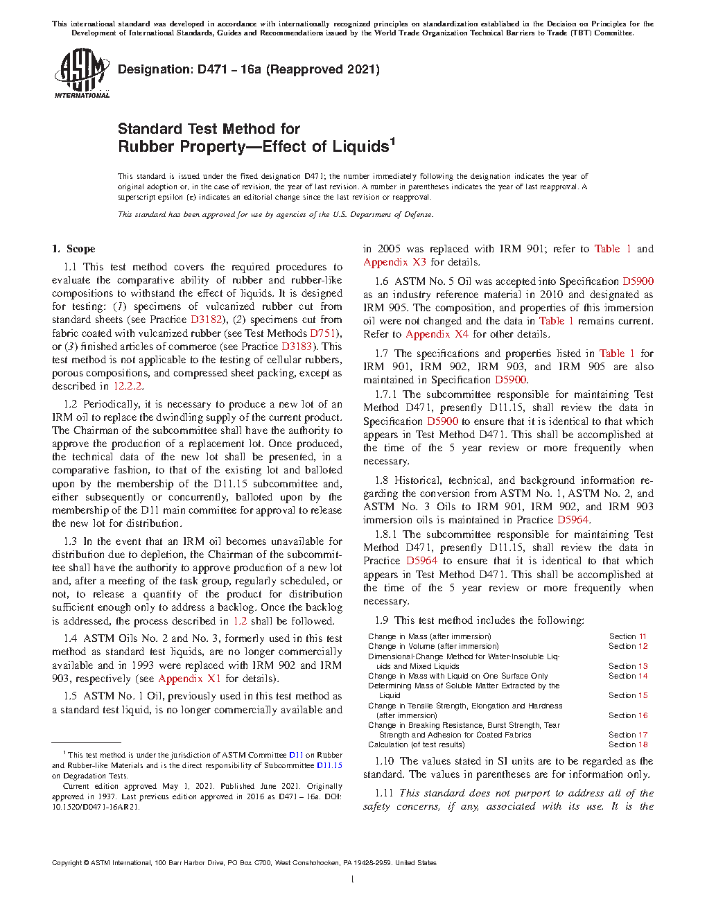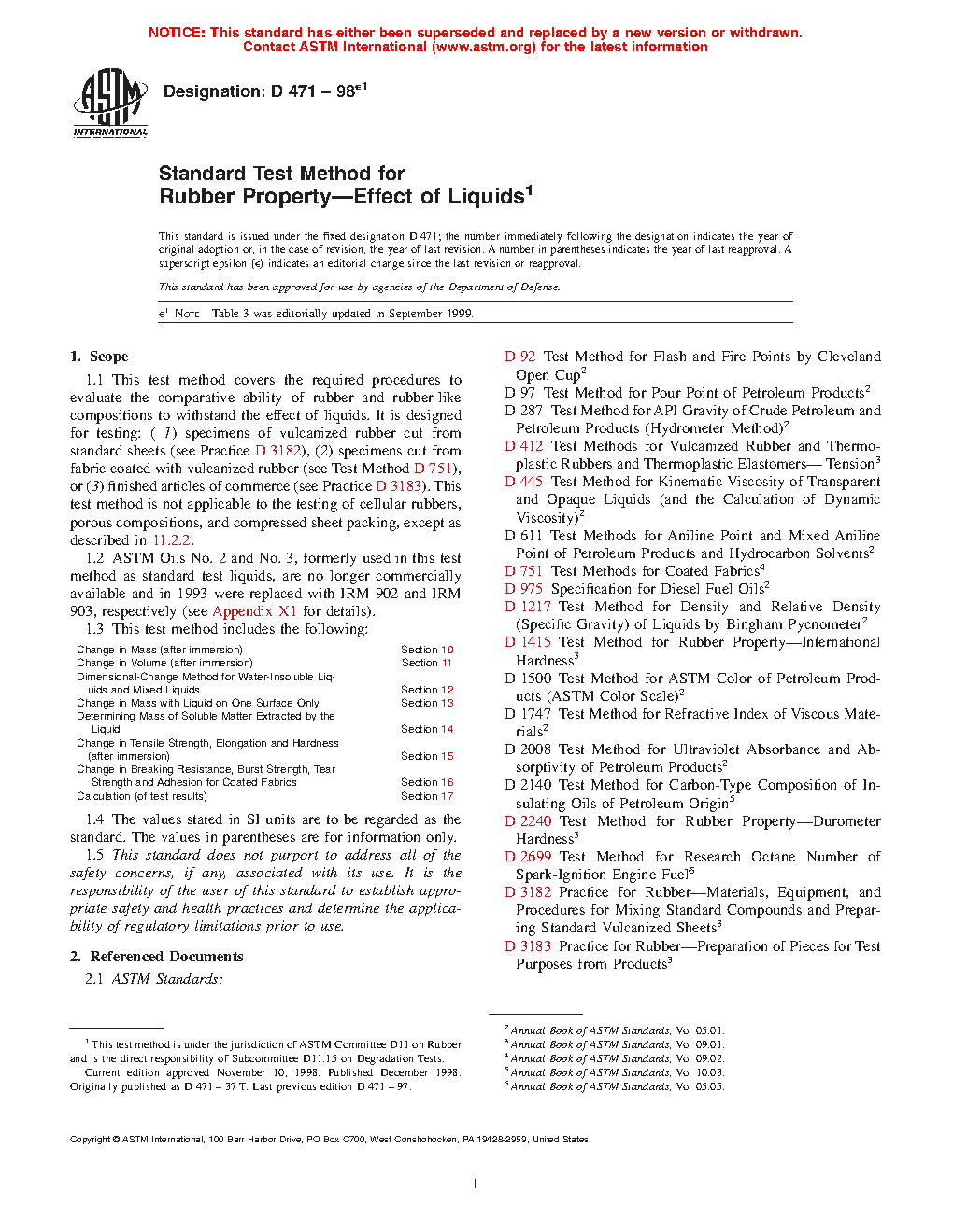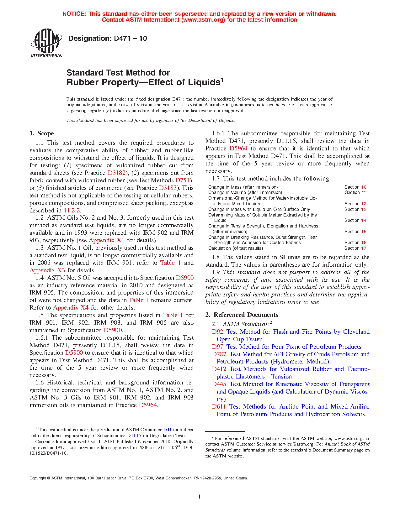 1.1 This test method covers the required procedures to evaluate the comparative ability of rubber and rubber-like compositions to withstand the effect of liquids. It is designed for testing: (1) specimens of vulcanized rubber cut from standard sheets (see Practice D3182), (2) specimens cut from fabric coated with vulcanized rubber (see Test Methods D751), or (3) finished articles of commerce (see Practice D3183). This test method is not applicable to the testing of cellular rubbers, porous compositions, and compressed sheet packing, except as described in 12.2.2.