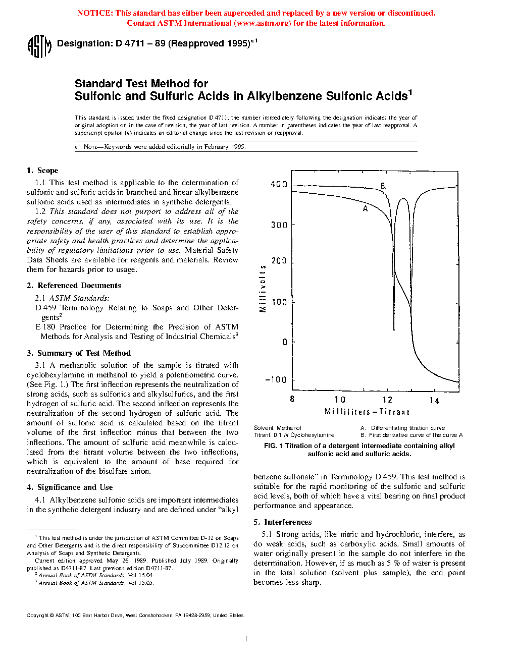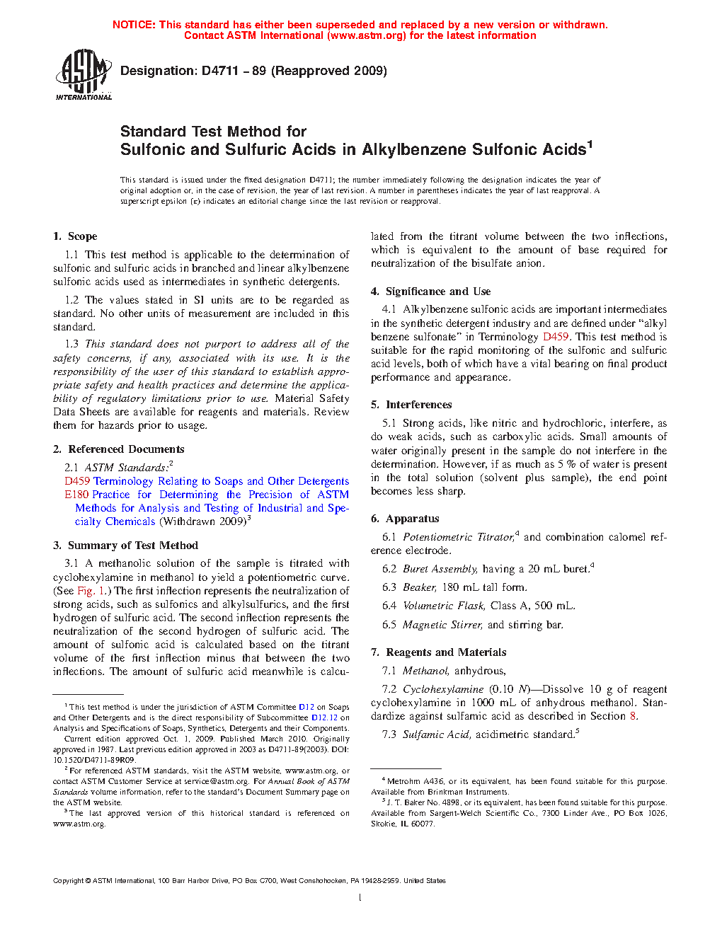 1.1 This test method is applicable to the determination of sulfonic and sulfuric acids in branched and linear alkylbenzene sulfonic acids used as intermediates in synthetic detergents.