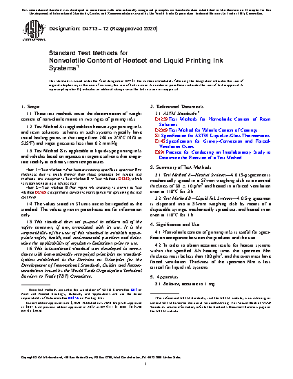 1.1 These test methods cover the determination of weight content of nonvolatile matter in two types of printing inks.