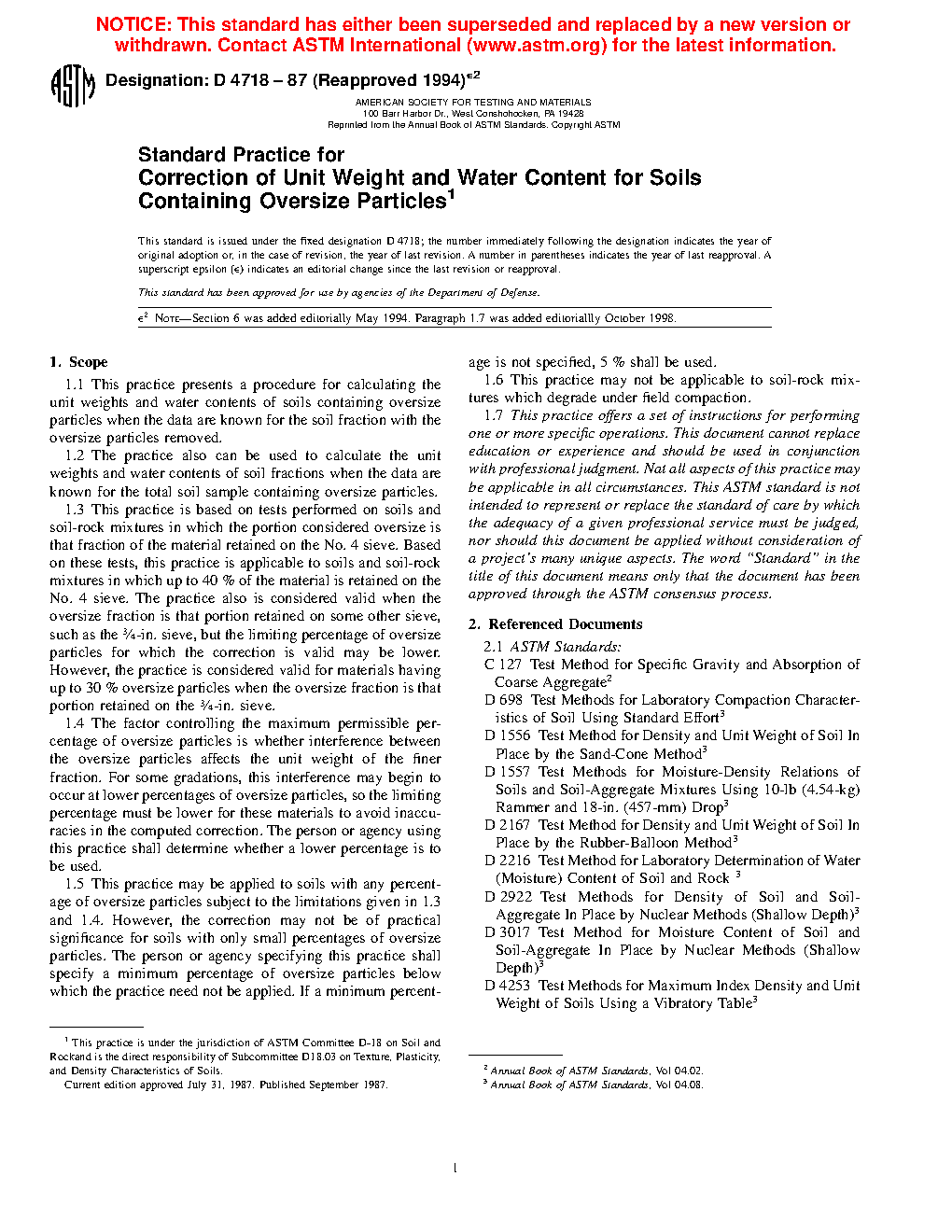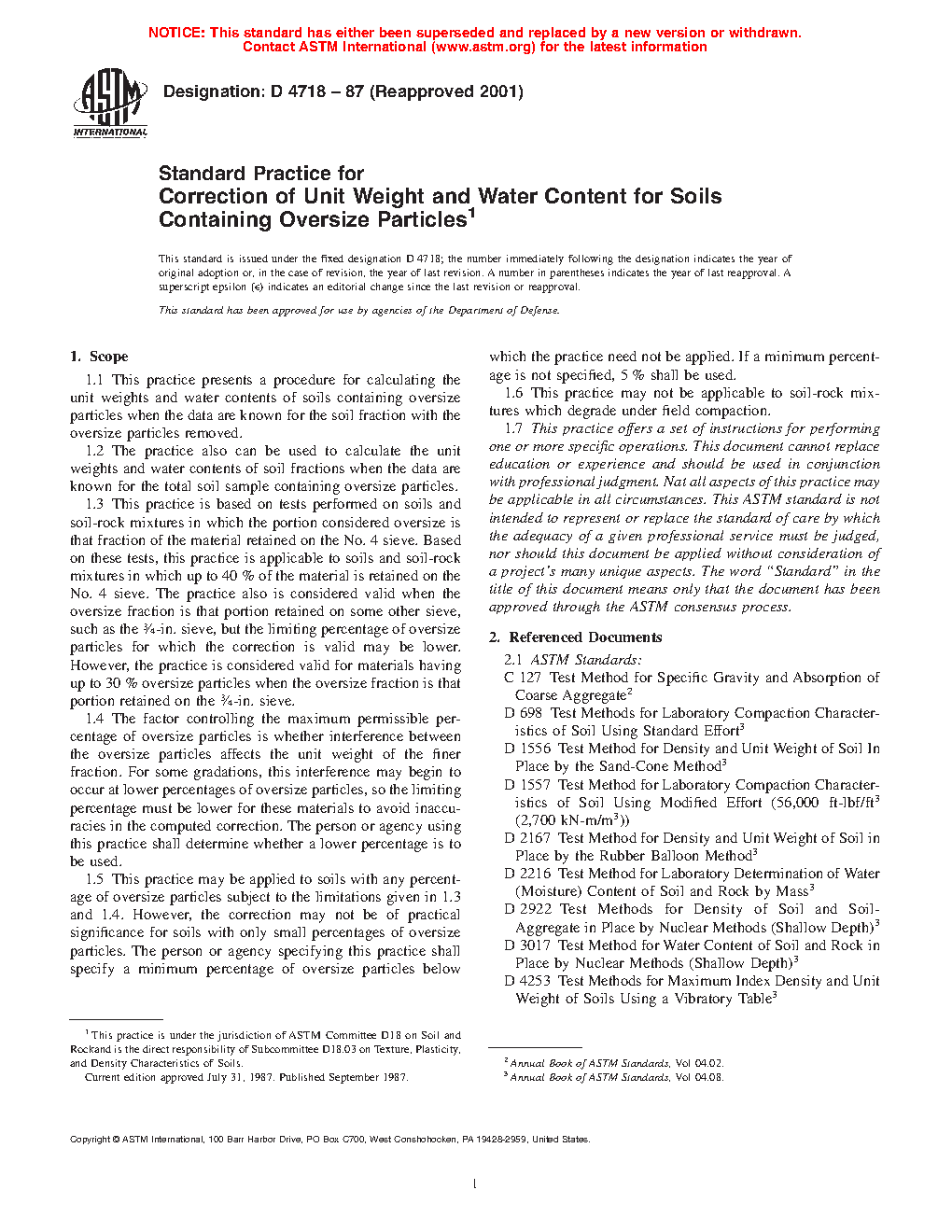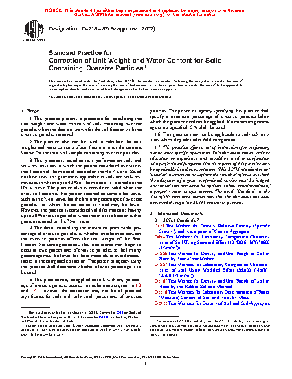 1.1 This practice presents a procedure for calculating the unit weights and water contents of soils containing oversize particles when the data are known for the soil fraction with the oversize particles removed.