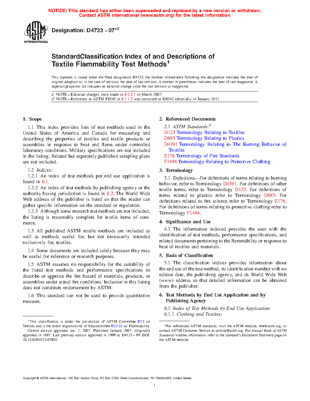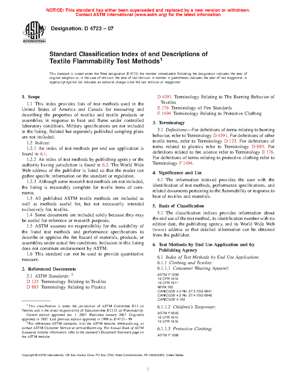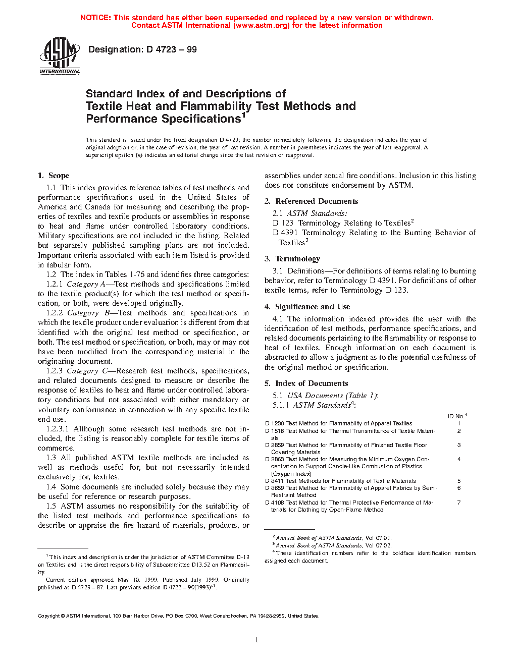 1.1 This index provides lists of test methods used in the United States of America and Canada for measuring and describing the properties of textiles and textile products or assemblies in response to heat and flame under controlled laboratory conditions. Military specifications are not included in the listing. Related but separately published sampling plans are not included.