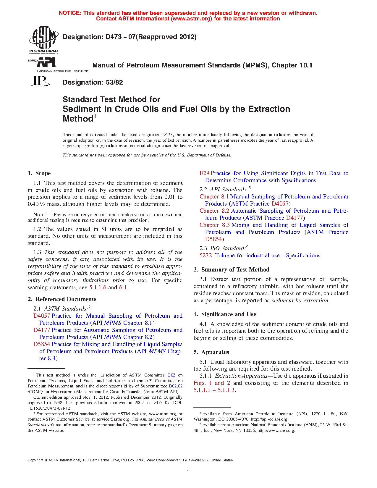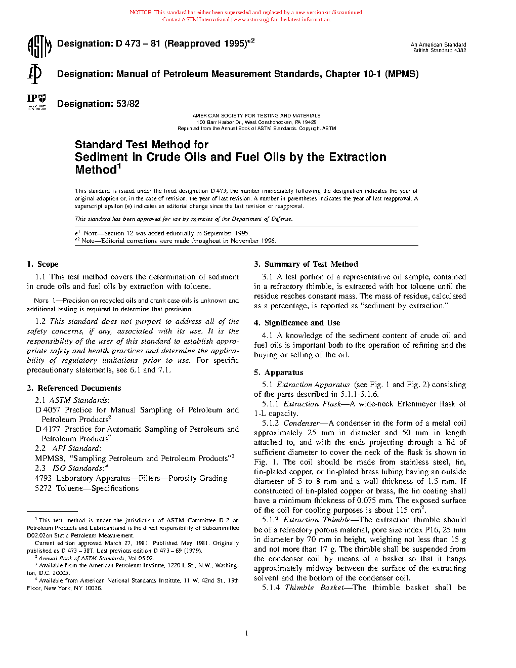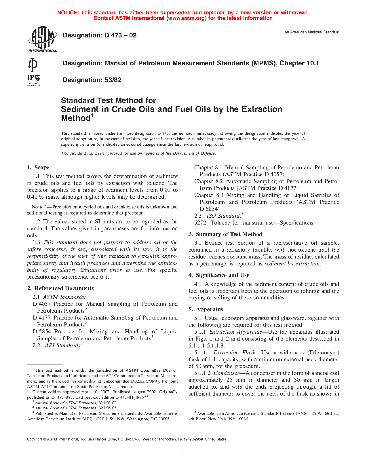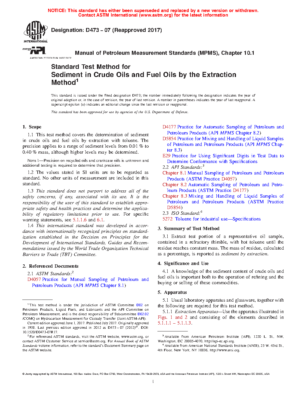 1.1 This test method covers the determination of sediment in crude oils and fuel oils by extraction with toluene. The precision applies to a range of sediment levels from 0.01 to 0.40 % mass, although higher levels may be determined.