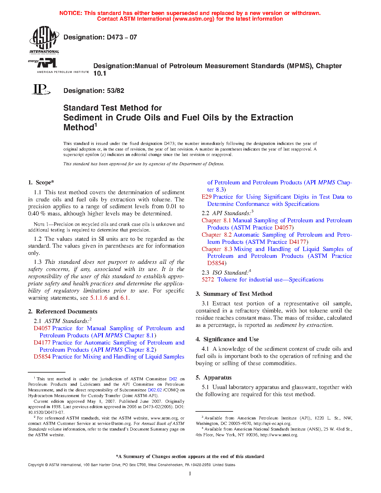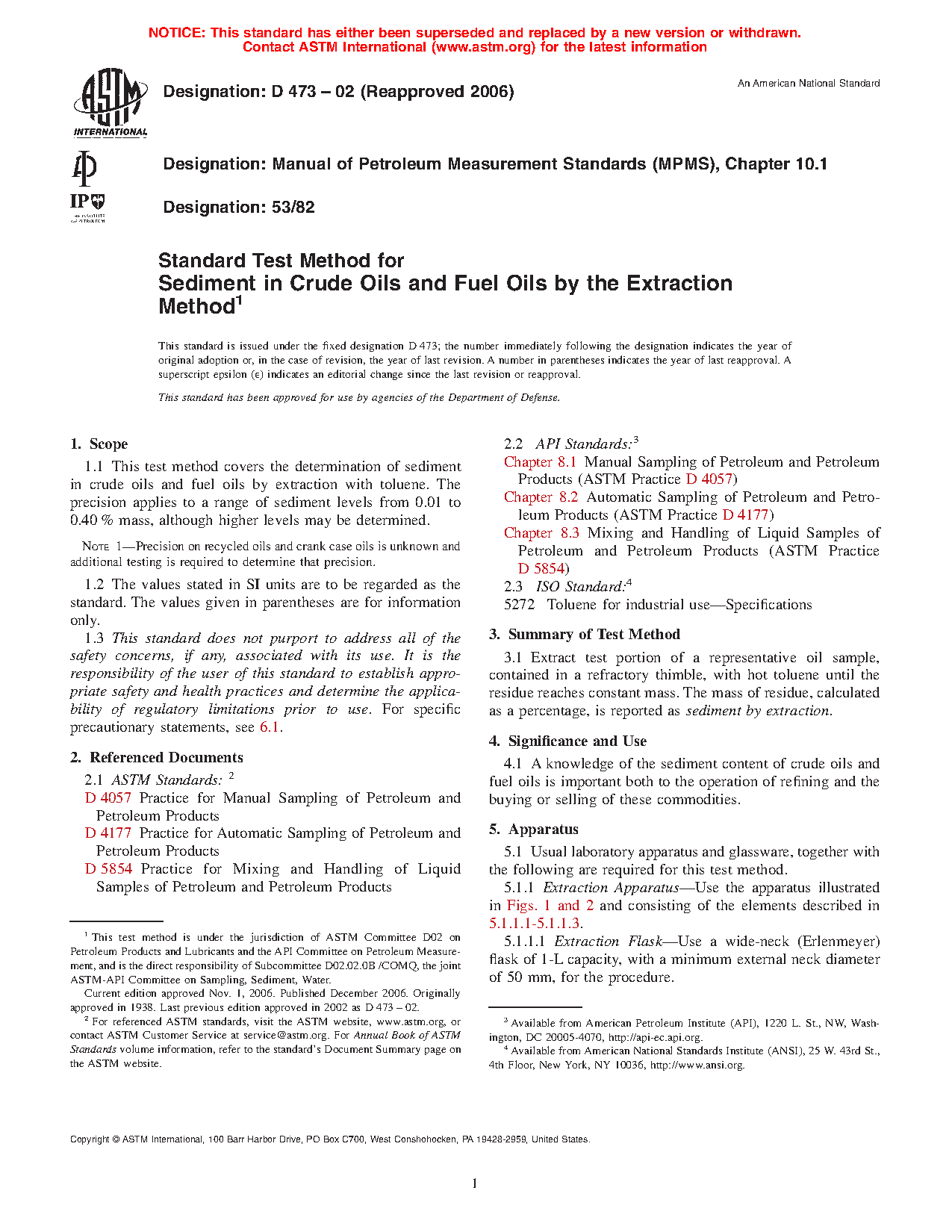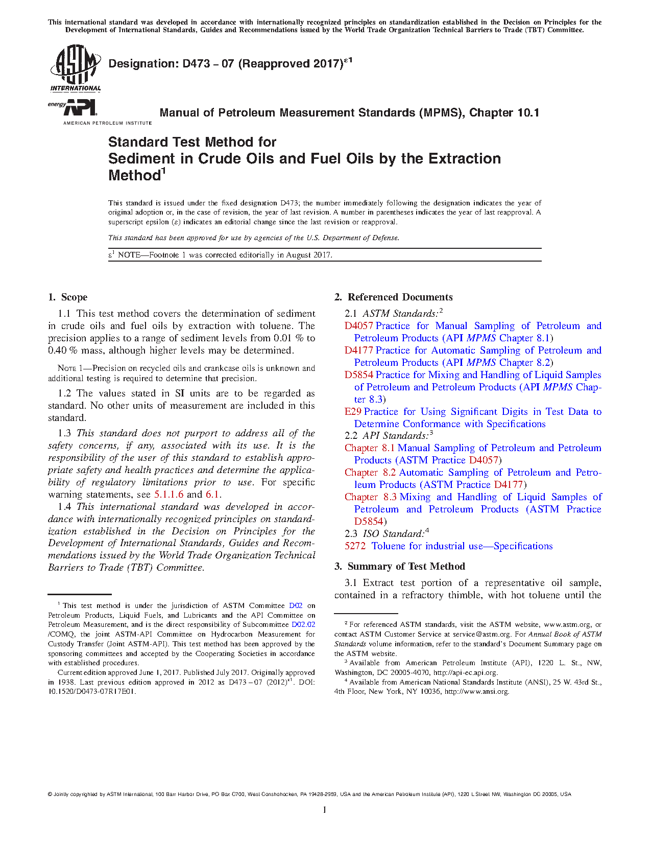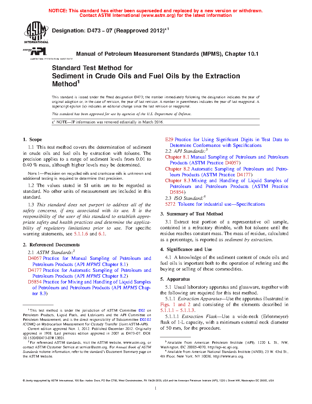 1.1 This test method covers the determination of sediment in crude oils and fuel oils by extraction with toluene. The precision applies to a range of sediment levels from 0.01 to 0.40 % mass, although higher levels may be determined.