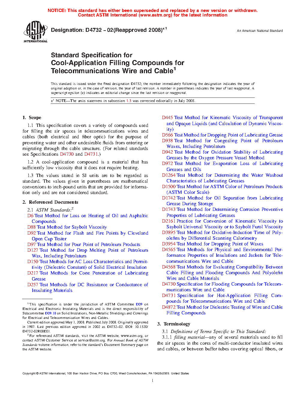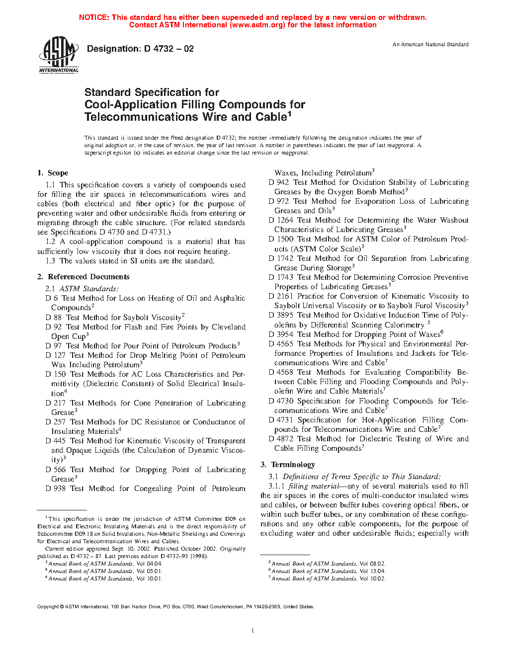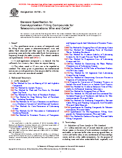 1.1 This specification covers a variety of compounds used for filling the air spaces in telecommunications wires and cables (both electrical and fiber optic) for the purpose of preventing water and other undesirable fluids from entering or migrating through the cable structure. (For related standards see Specifications D 4730 and D 4731