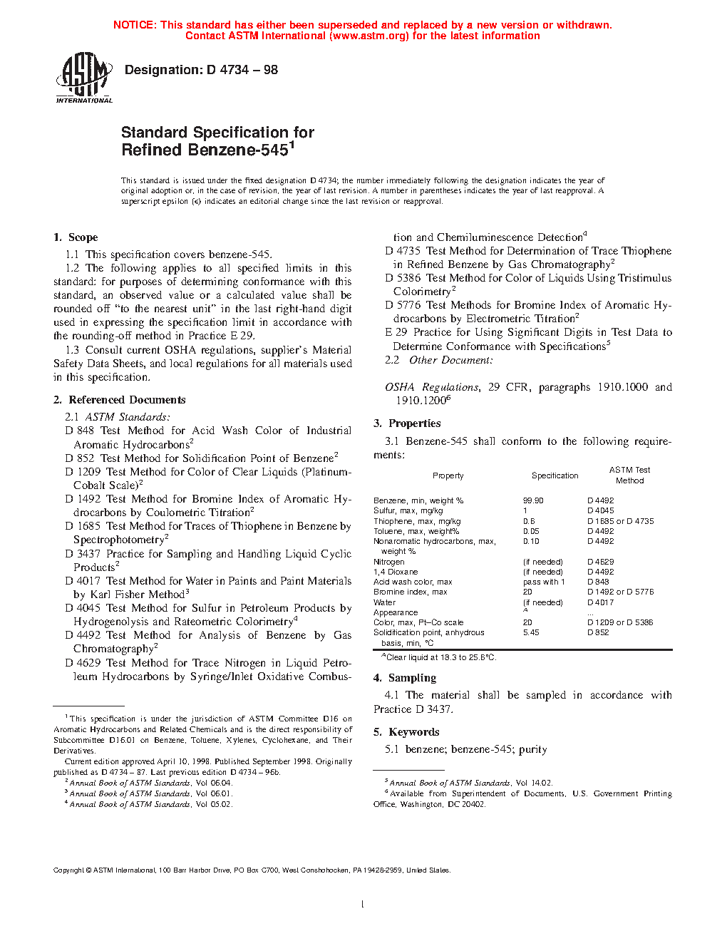 This specification covers benzene-545. Tests shall be performed to determine the property requirements of benzene-545 in accordance to the following test methods: benzene weight percentage; sulfur mass; thiophene mass; toluene mass; nonaromatic hydrocarbons weight percentage; nitrogen mass; acid wash color; bromine index, water, appearance, and solidification point.
