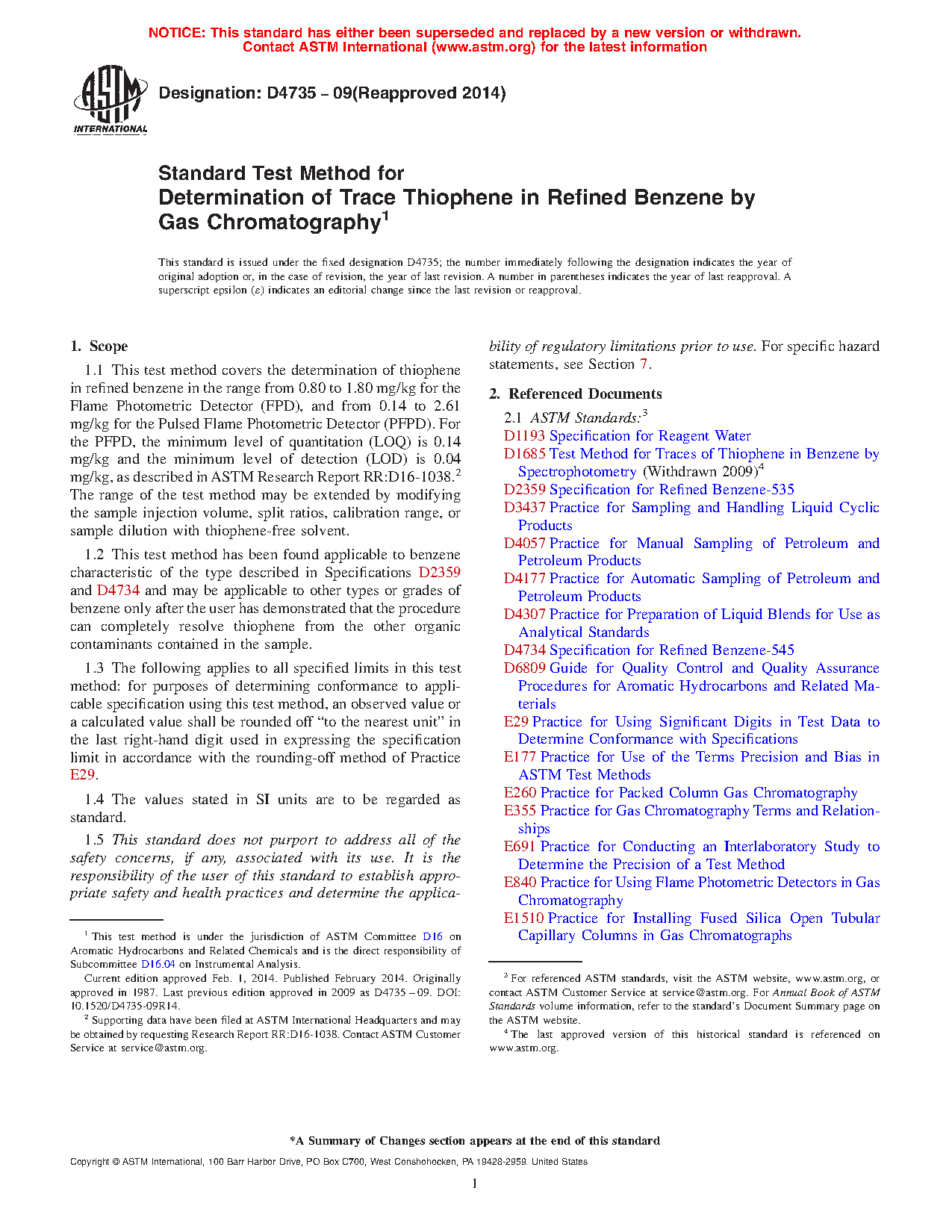 1.1 This test method covers the determination of thiophene in refined benzene in the range from 0.80 to 1.80 mg/kg for the Flame Photometric Detector (FPD), and from 0.14 to 2.61 mg/kg for the Pulsed Flame Photometric Detector (PFPD). For the PFPD, the minimum level of quantitation (LOQ) is 0.14 mg/kg and the minimum level of detection (LOD) is 0.04 mg/kg, as described in ASTM Research Report RR:D16-1038.2 The range of the test method may be extended by modifying the sample injection volume, split ratios, calibration range, or sample dilution with thiophene-free solvent.