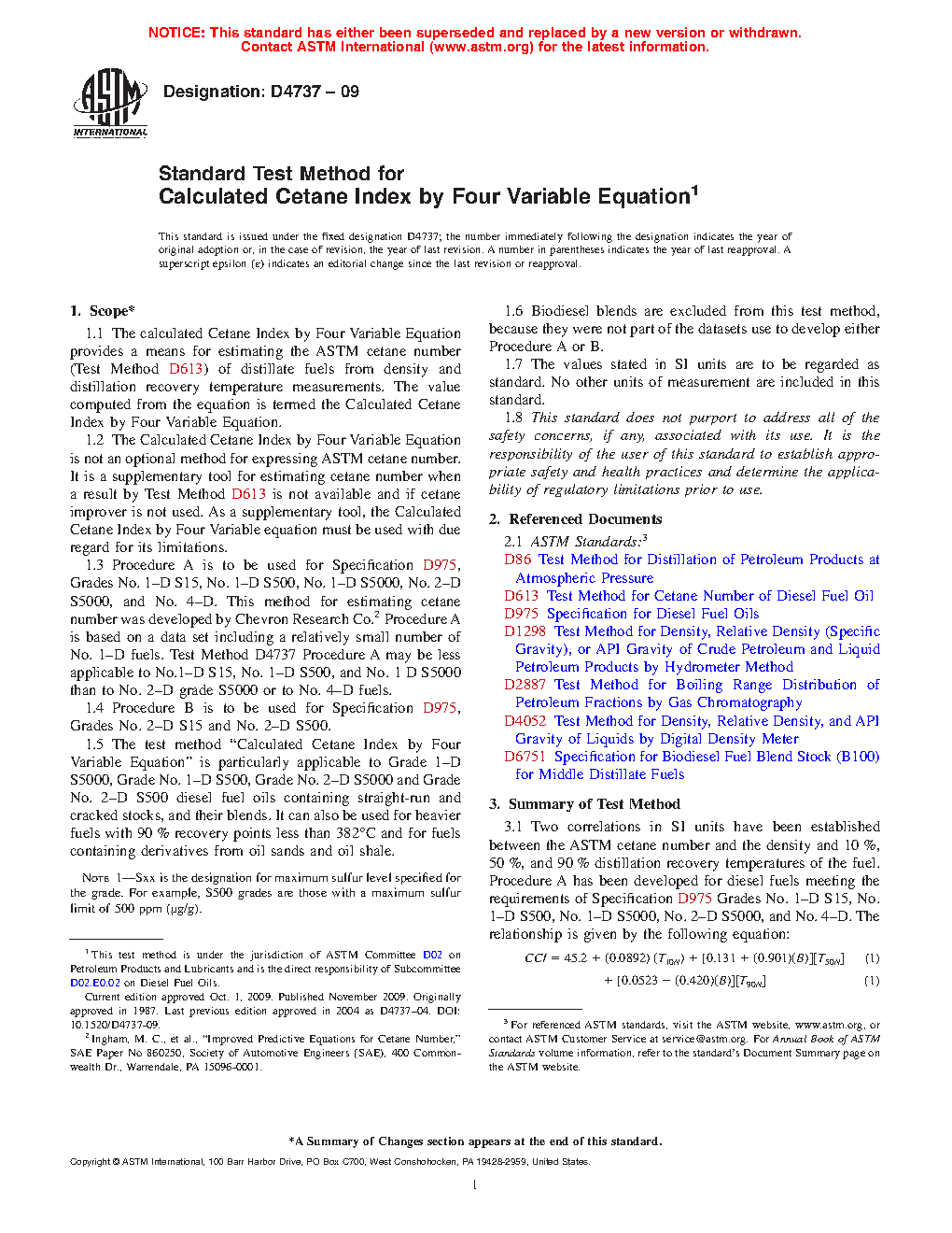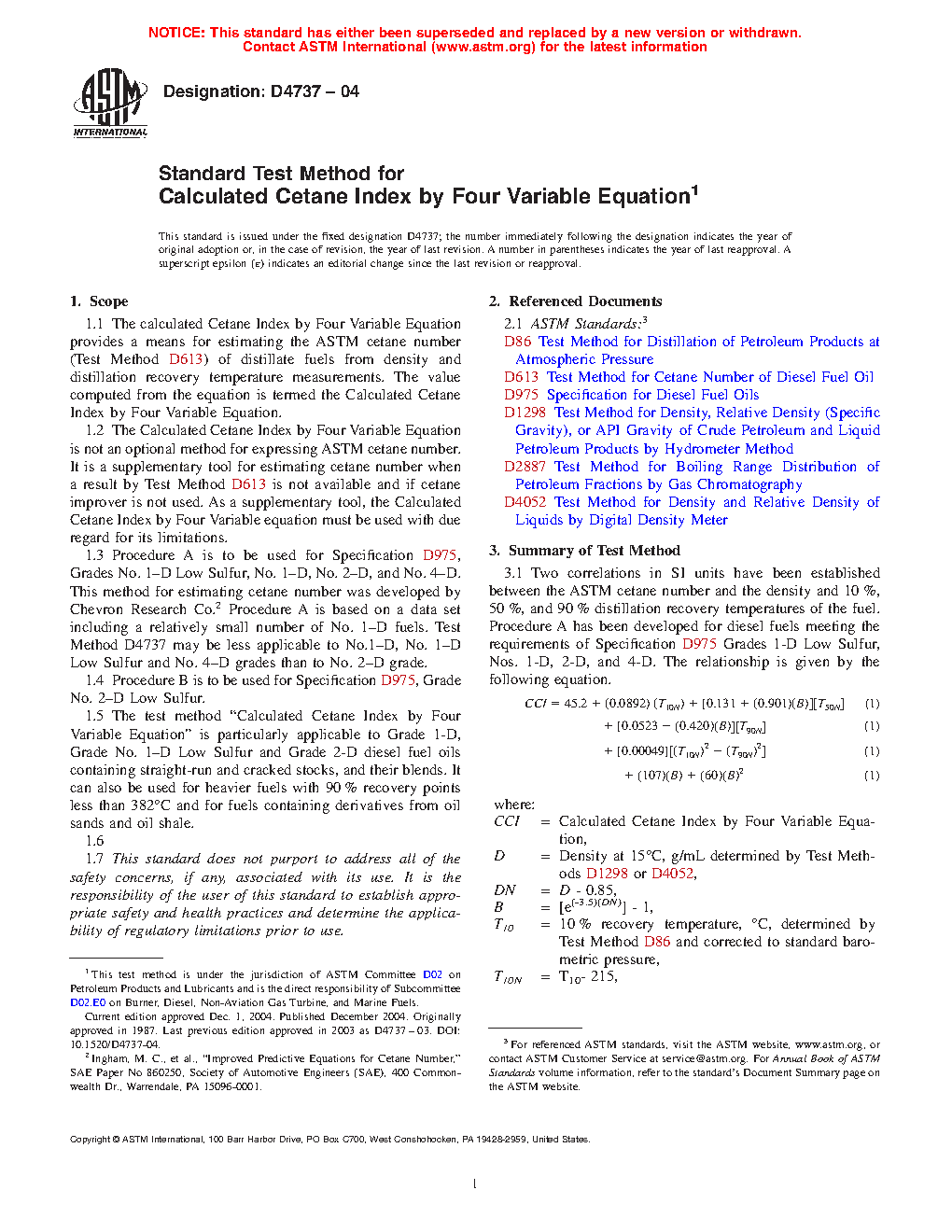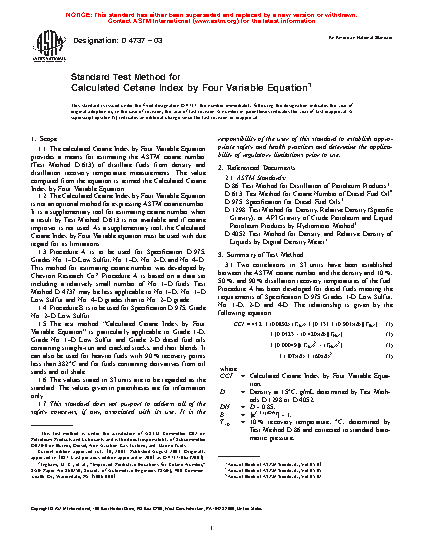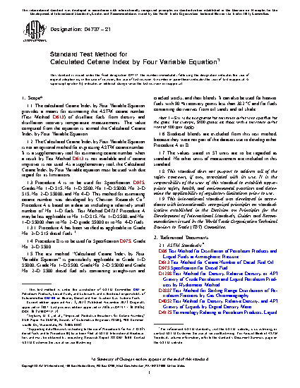 1.1 The calculated Cetane Index by Four Variable Equation provides a means for estimating the ASTM cetane number (Test Method D613) of distillate fuels from density and distillation recovery temperature measurements. The value computed from the equation is termed the Calculated Cetane Index by Four Variable Equation.