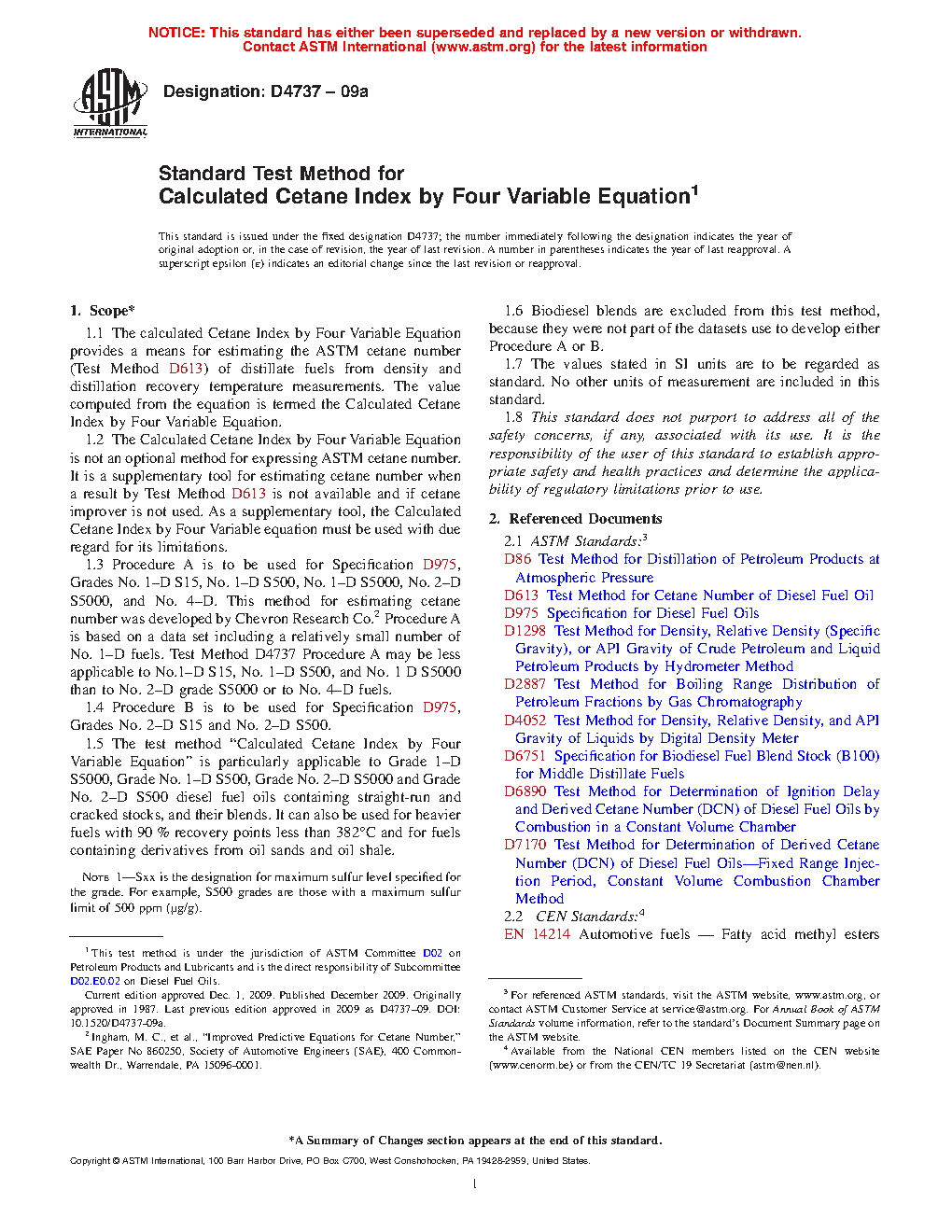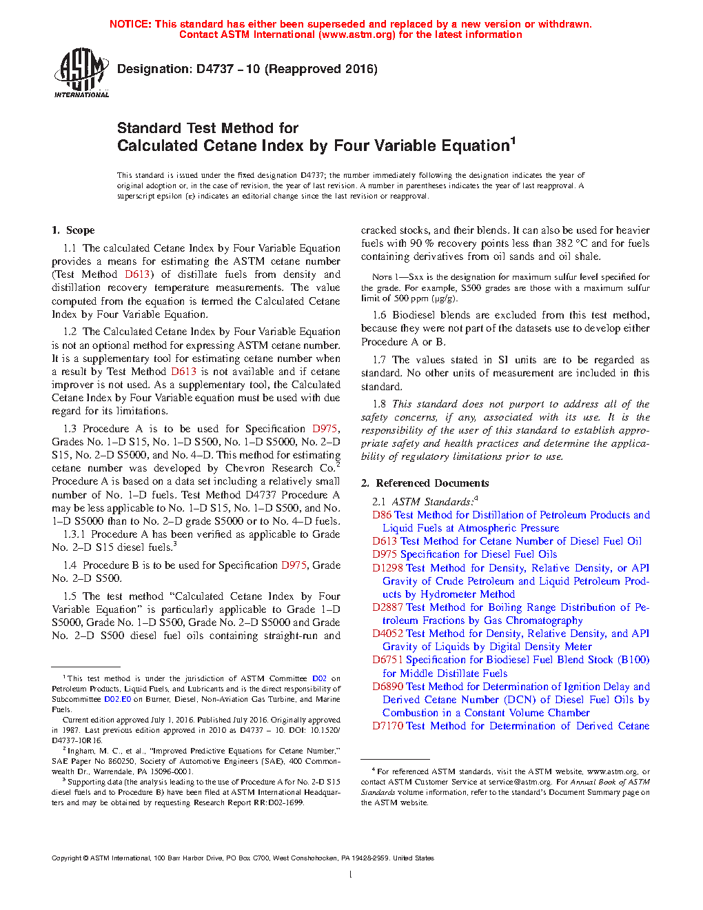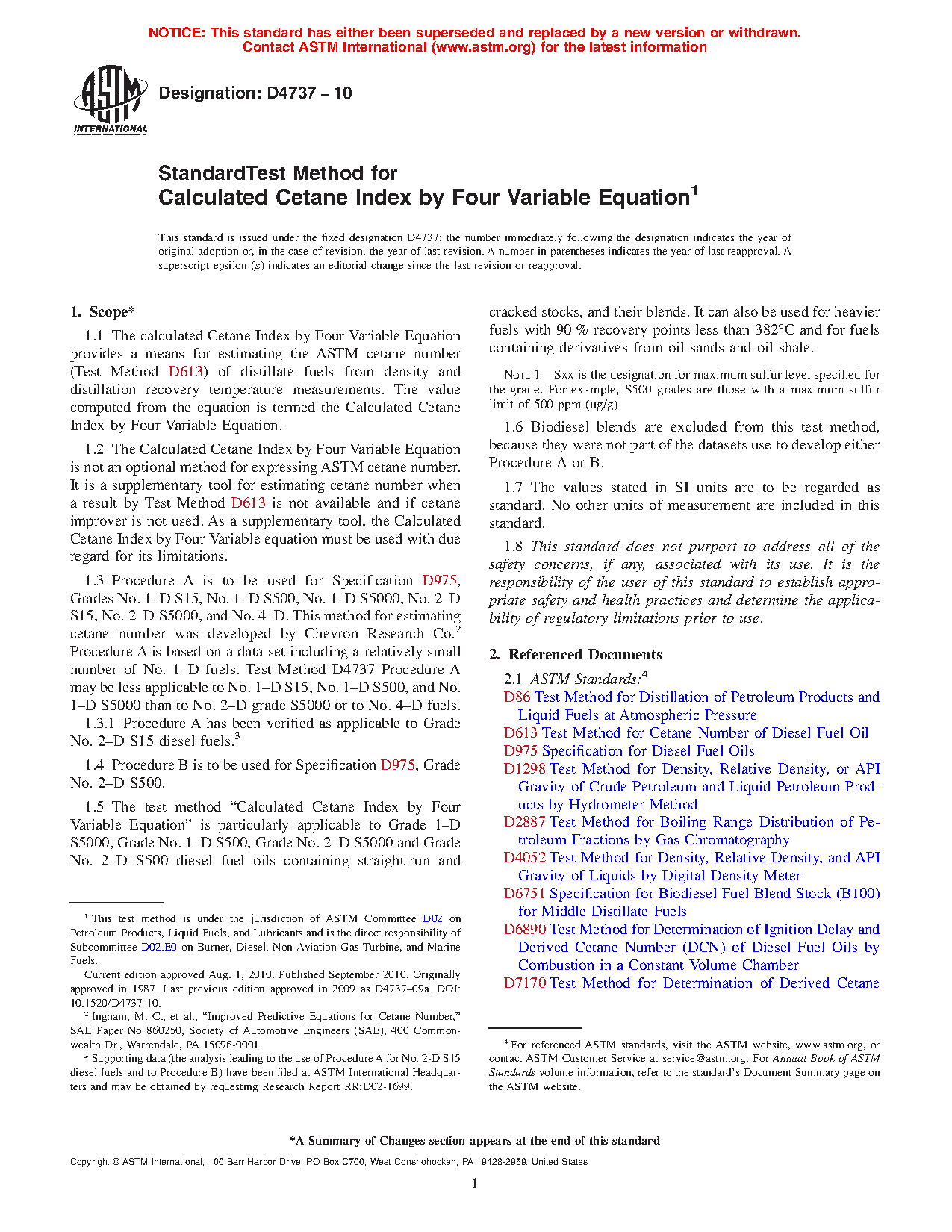 1.1 The calculated Cetane Index by Four Variable Equation provides a means for estimating the ASTM cetane number (Test Method D613) of distillate fuels from density and distillation recovery temperature measurements. The value computed from the equation is termed the Calculated Cetane Index by Four Variable Equation.