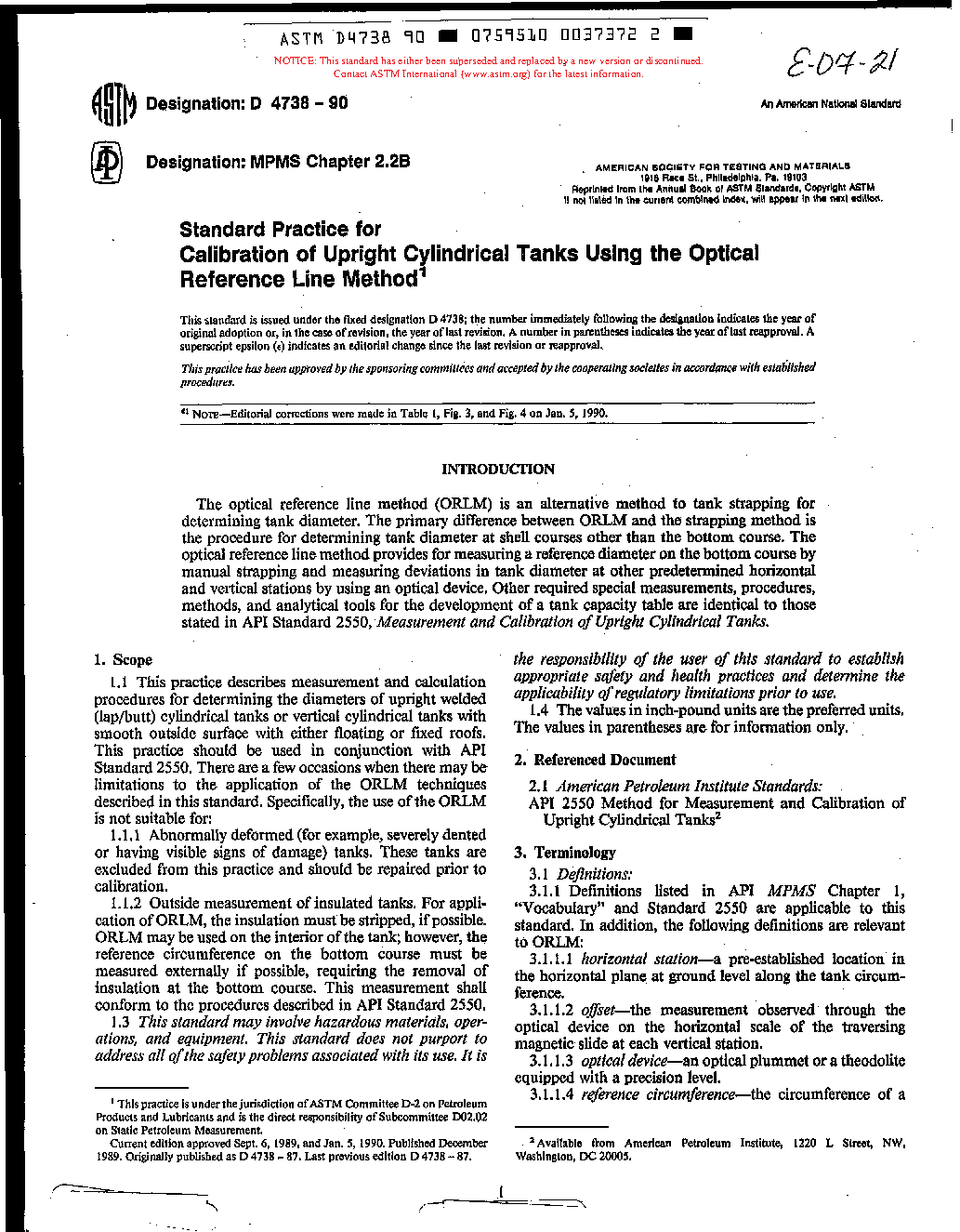 Practice For Calibration Of Upright Cylindrical Tanks Using Optical Reference Line Method (Withdrawn 1995)