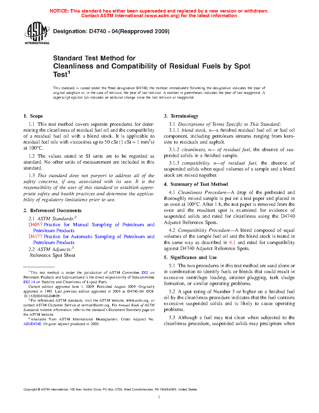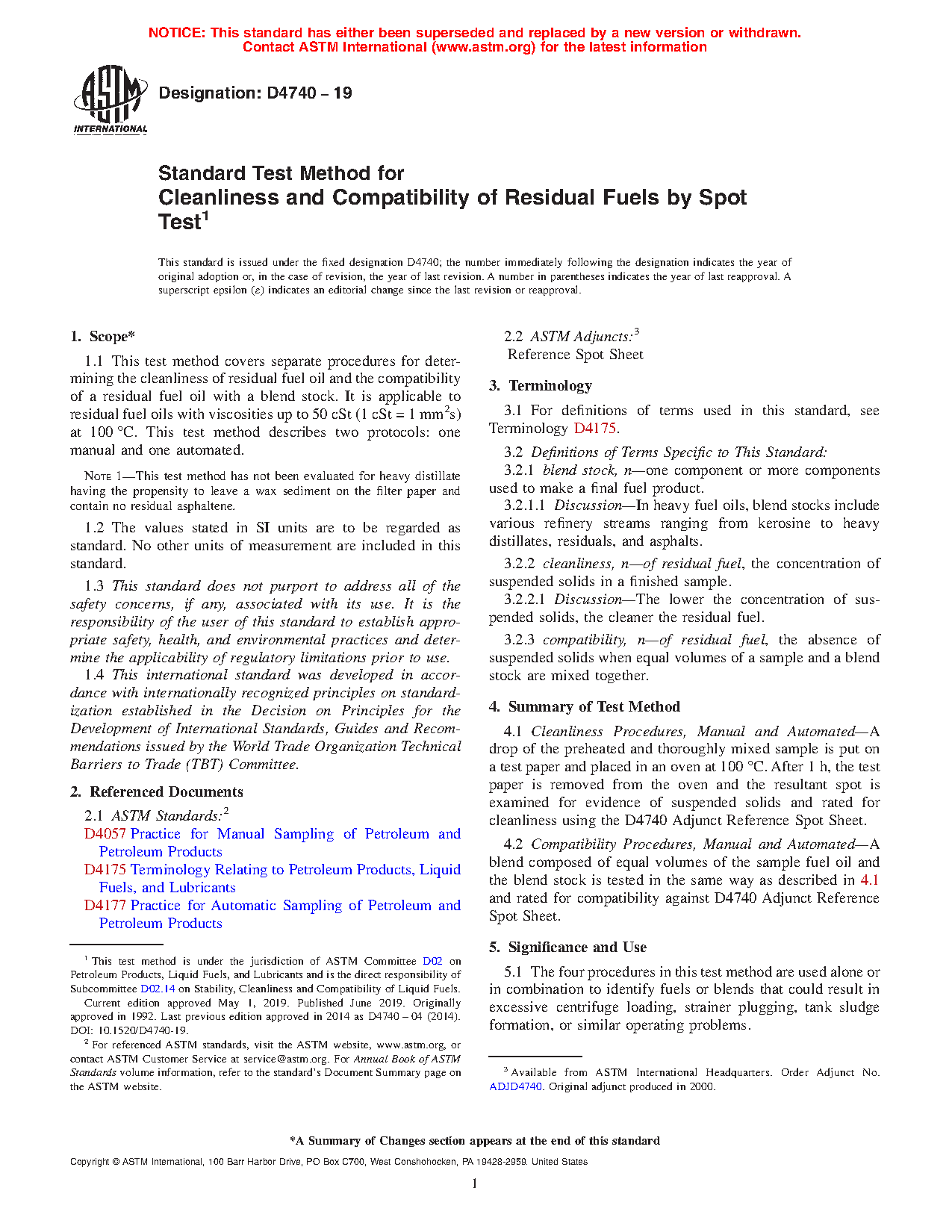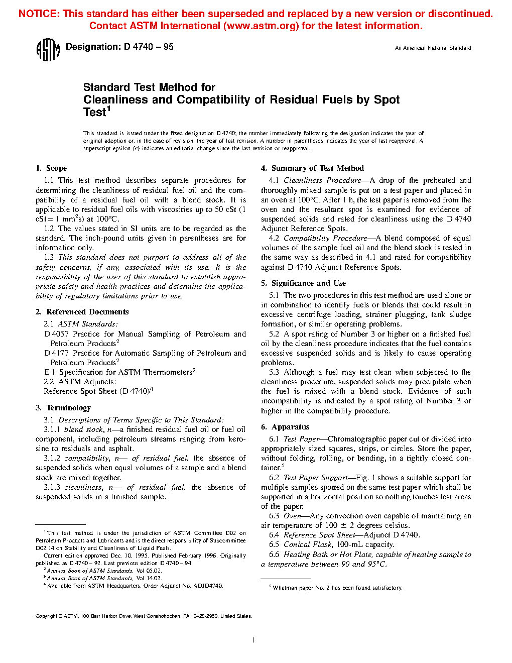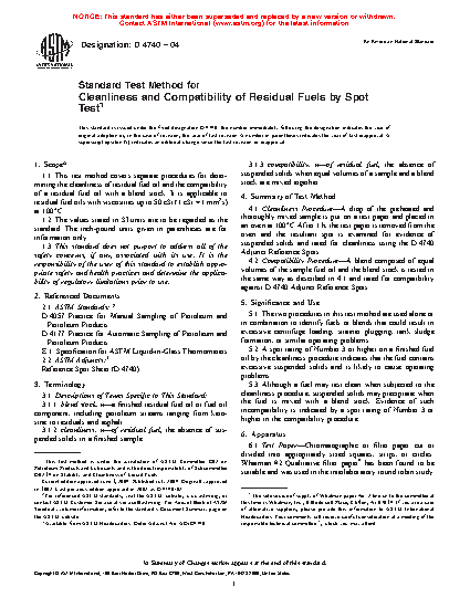 1.1 This test method covers separate procedures for determining the cleanliness of residual fuel oil and the compatibility of a residual fuel oil with a blend stock. It is applicable to residual fuel oils with viscosities up to 50 cSt (1 cSt = 1 mm2s) at 100°C.