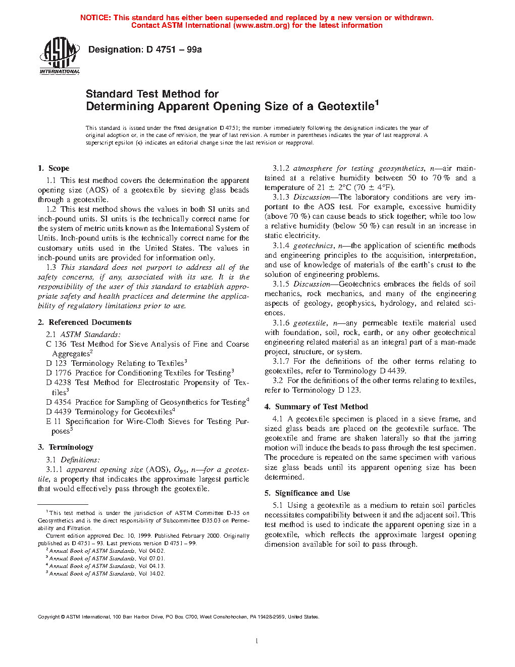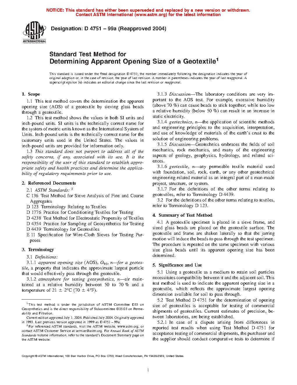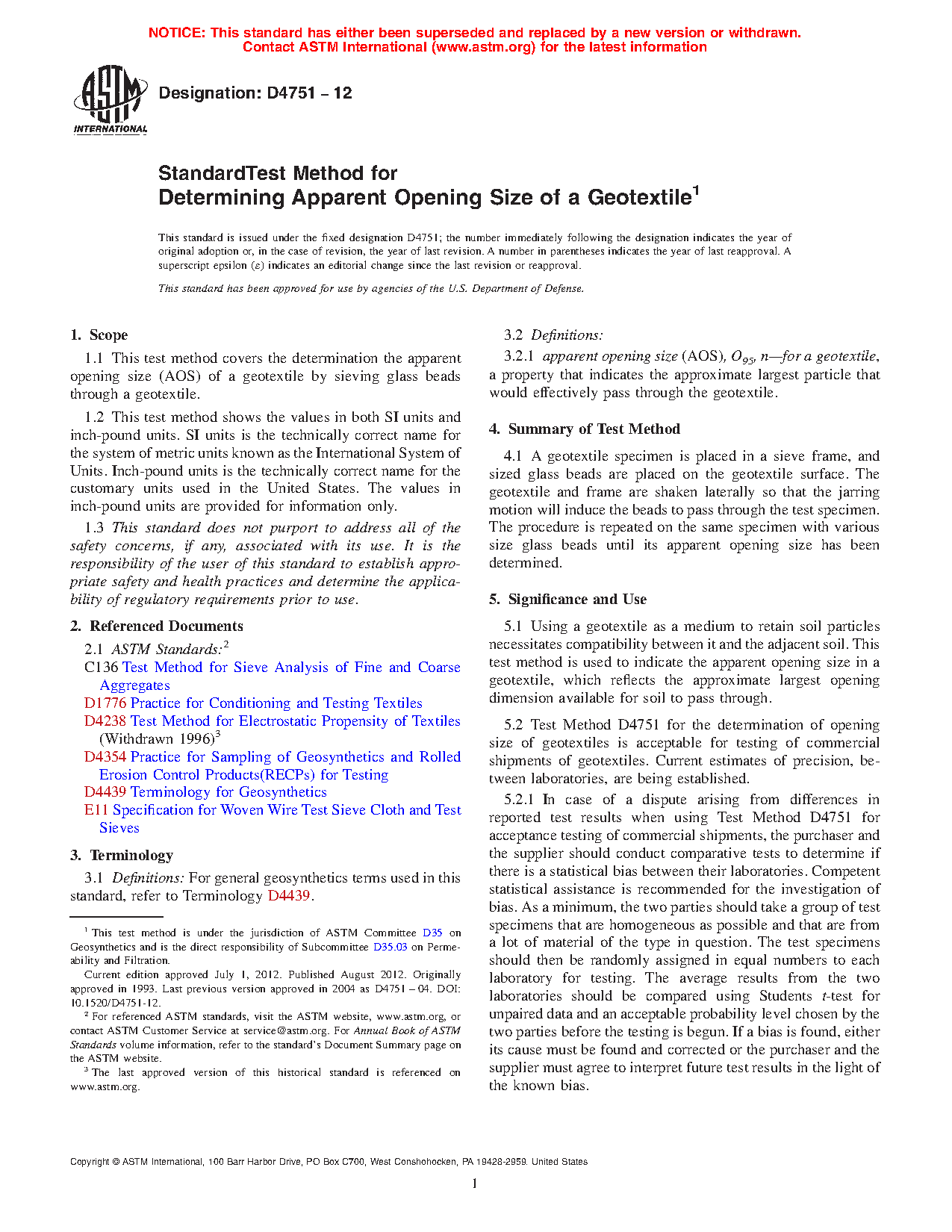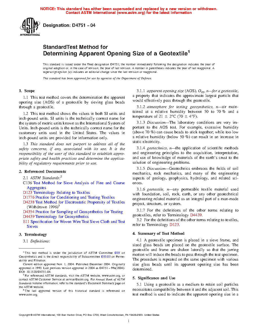5.2 Test Methods D4751 for the determination of opening size of geotextiles is acceptable for testing of commercial shipments of geotextiles. Current estimates of precision, between laboratories, have been established.