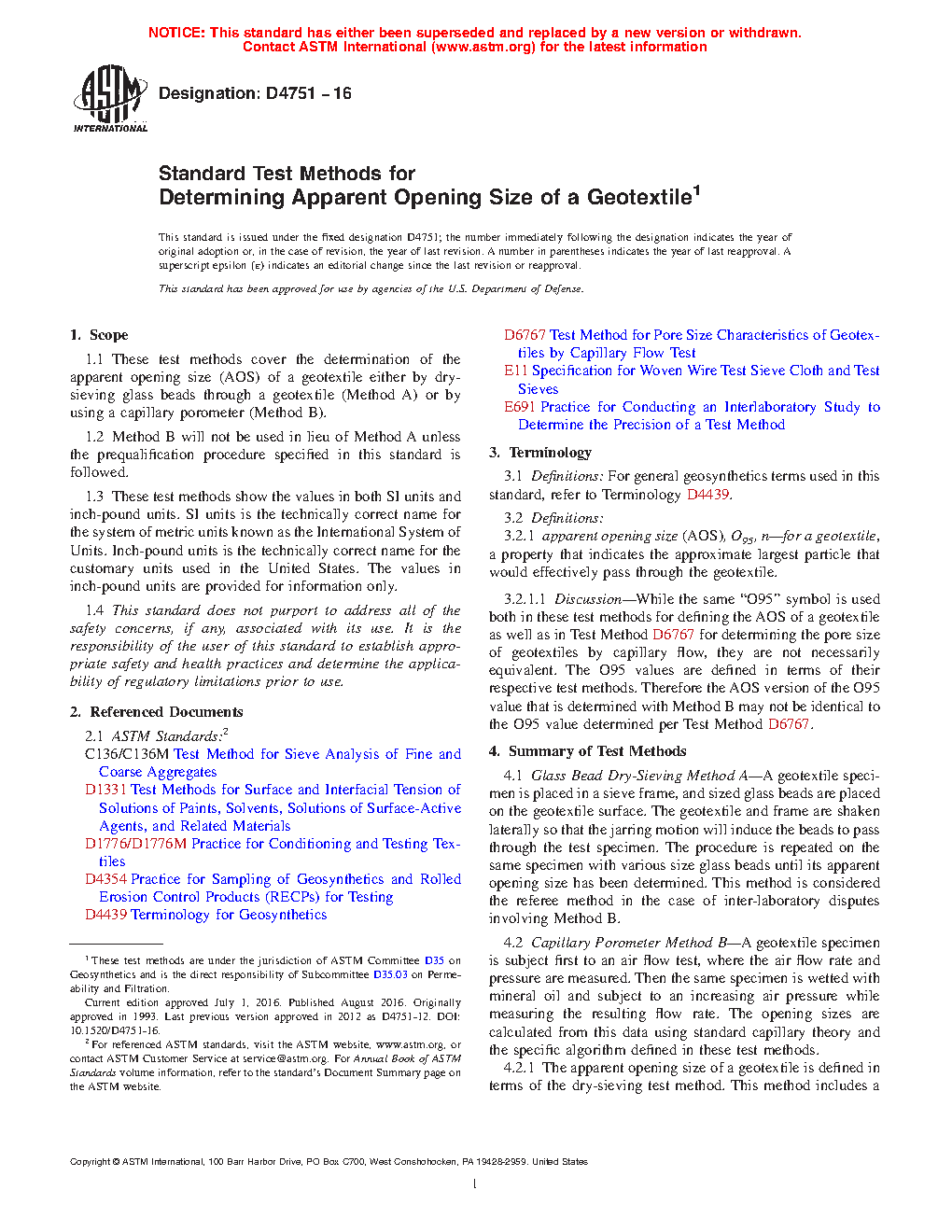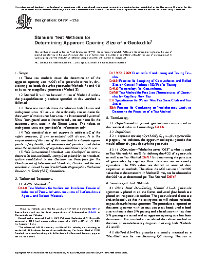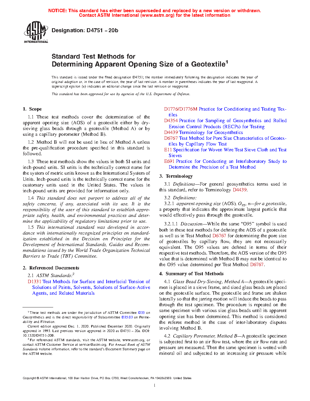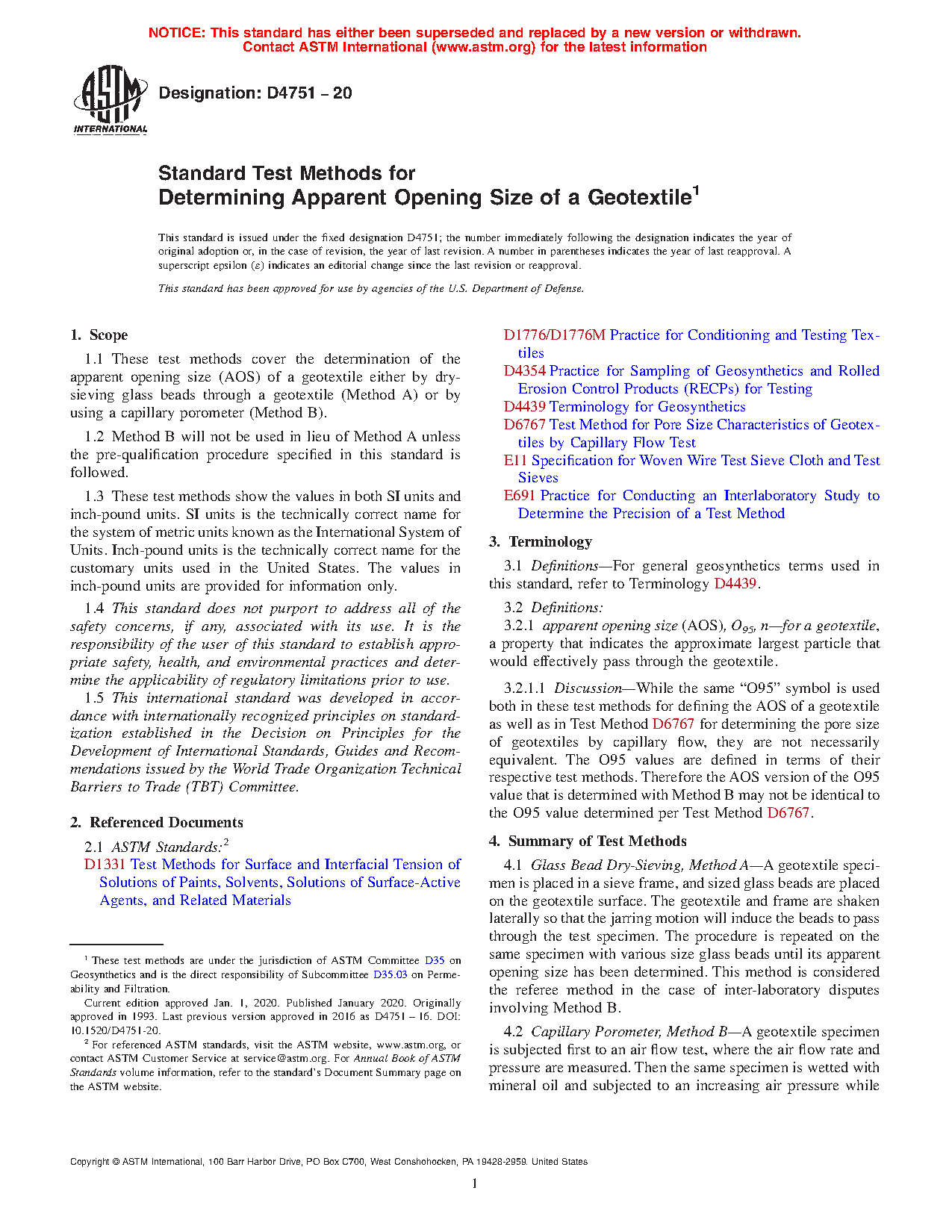 1.1 These test methods cover the determination of the apparent opening size (AOS) of a geotextile either by dry-sieving glass beads through a geotextile (Method A) or by using a capillary porometer (Method B).