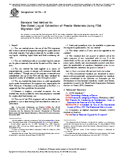 1.1 This test method covers the use of the FDA migration cell in the extraction of components and permits quantitation of individual migrants from plastic materials by suitable extracting liquids, including liquid foods and food-stimulating solvents.