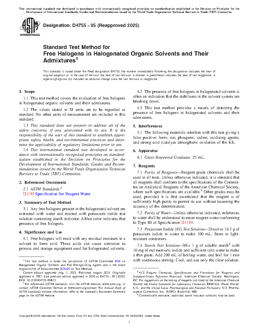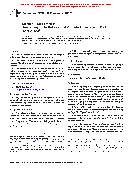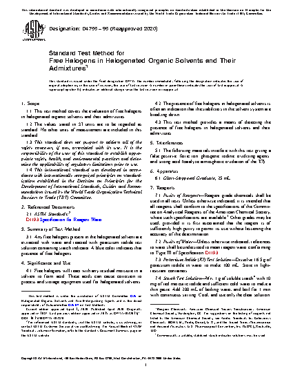 1.1 This test method covers the evaluation of free halogens in halogenated organic solvents and their admixtures.