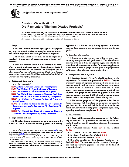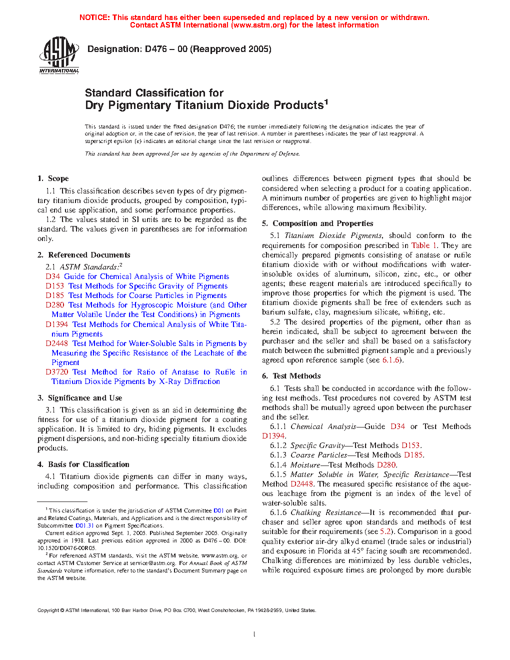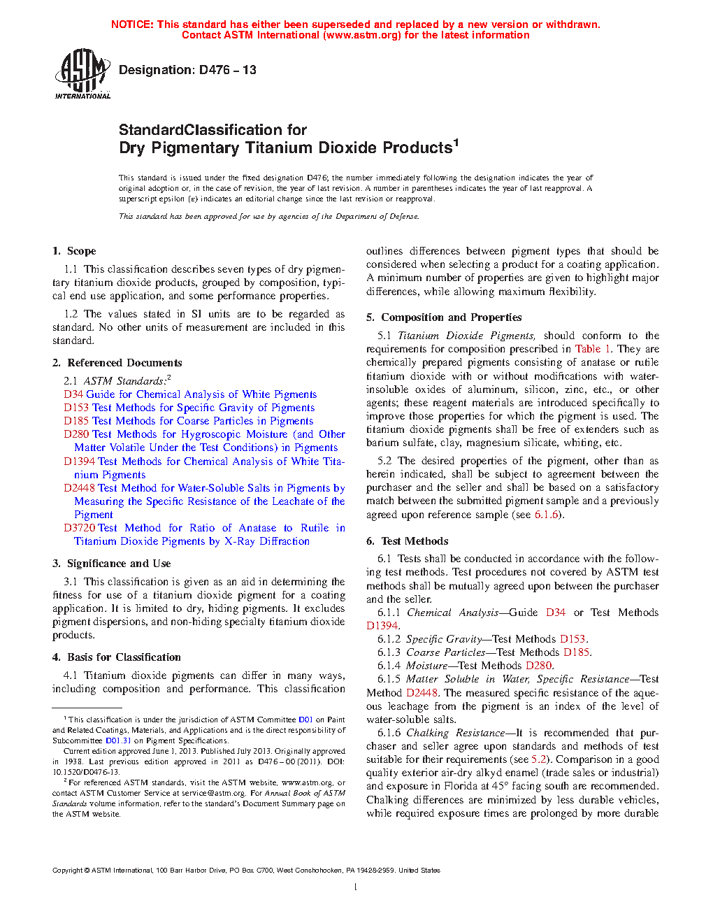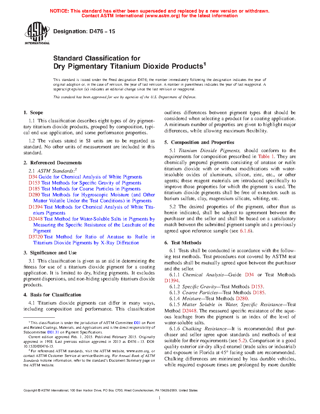 This classification is given as an aid in determining the fitness for use of a titanium dioxide pigment for a coating application. It is limited to dry, hiding pigments. It excludes pigment dispersions, and non-hiding specialty titanium dioxide products.