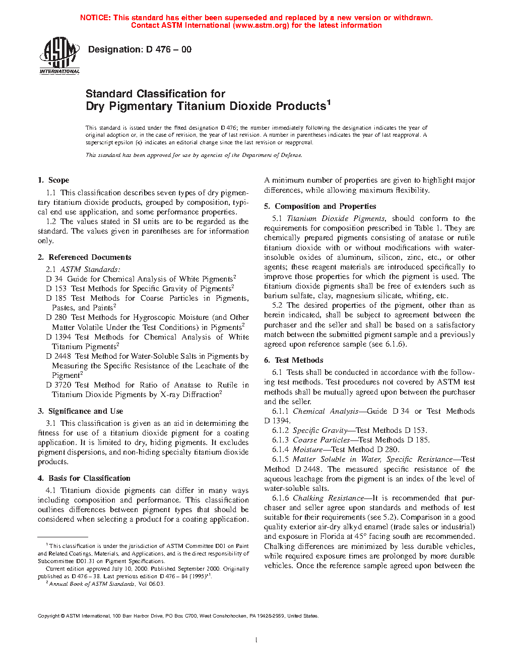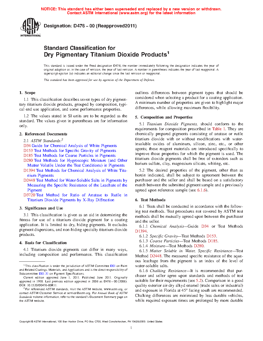 1.1 This classification describes seven types of dry pigmentary titanium dioxide products, grouped by composition, typical end use application, and some performance properties.