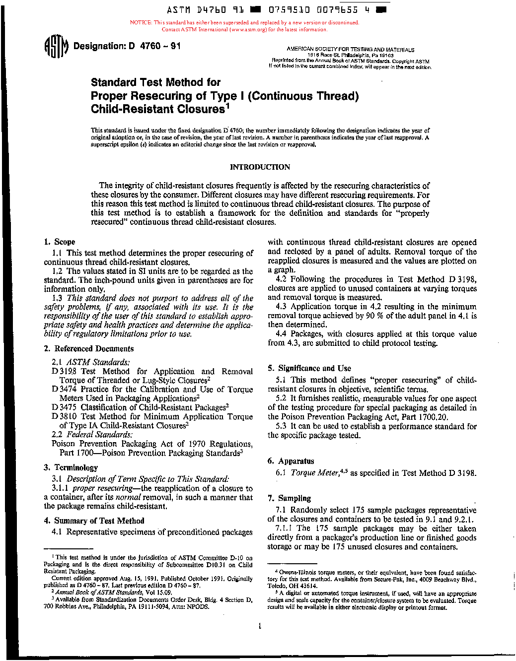 Test Method for Proper Resecuring of Type 1 (Continuous Thread) Child-Resistant Closures (Withdrawn 1997)