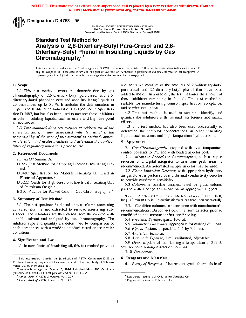Standard Test Method for Analysis of 2,6-Ditertiary-Butyl Para-Cresol and 2,6-Ditertiary- Butyl Phenol in Insulating Liquids by Gas Chromatography