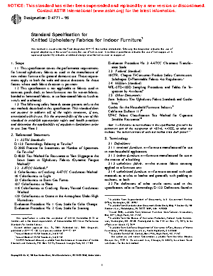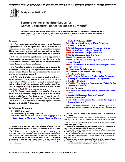 1.1 This performance specification covers the performance requirements for knitted upholstery fabrics as used in the manufacture of new indoor furniture for general domestic use. These requirements apply to both the wale and course directions for those factors where each fabric direction is pertinent.